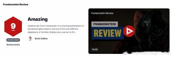 今日,IGN为“陀螺”吉尔莫·德尔·托罗指导科幻新片打出9分的高分评价,影评人认为这不仅是这位备受喜爱类型片导演的集大成之作,更堪称影史对玛丽·雪莱原著最有力的改编之一。