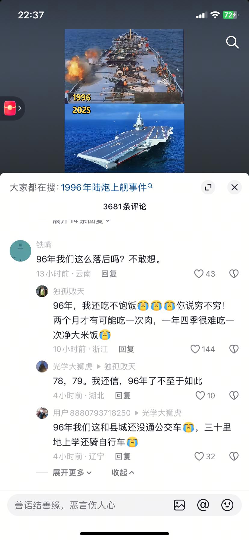 30年弹指一挥间,好多网友不敢相信,那时有这么落后吗! 一位浙江网友说,我还吃不饱饭,两个月才能吃一次肉,一年四季很难吃一次净大米饭。 一位辽宁网友说,我们家与县城没通公交车,30里骑车上学。 96年你们那啥情况?