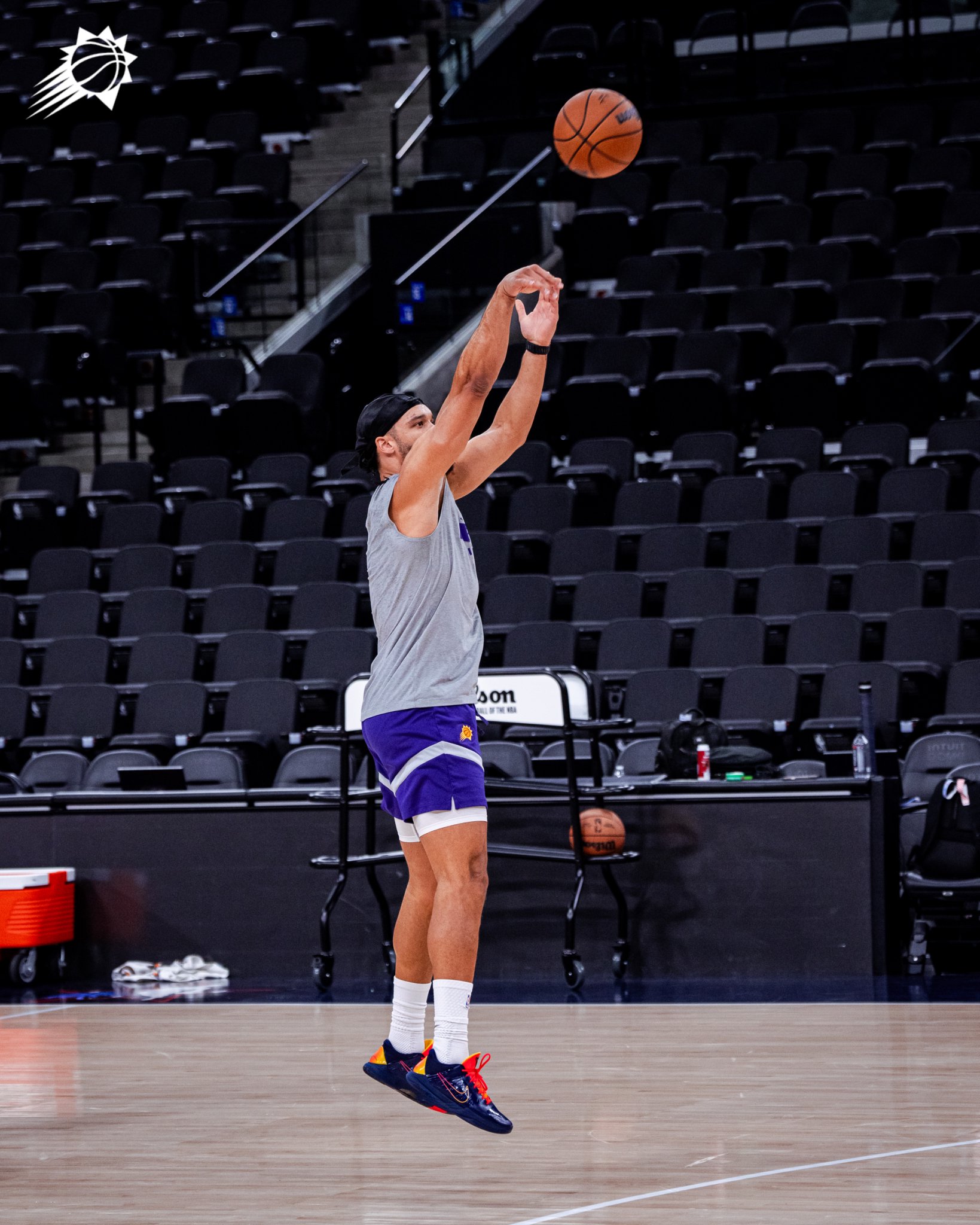 赛前,太阳社媒分享球员们赛前踩场训练的瞬间,杰伦-格林表情轻松。