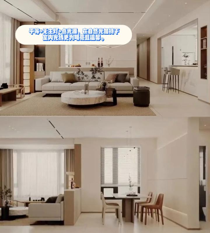 三室两厅奶油风。 面积:126m2。 平等+无主灯+点光源,在自然光加特下室内光