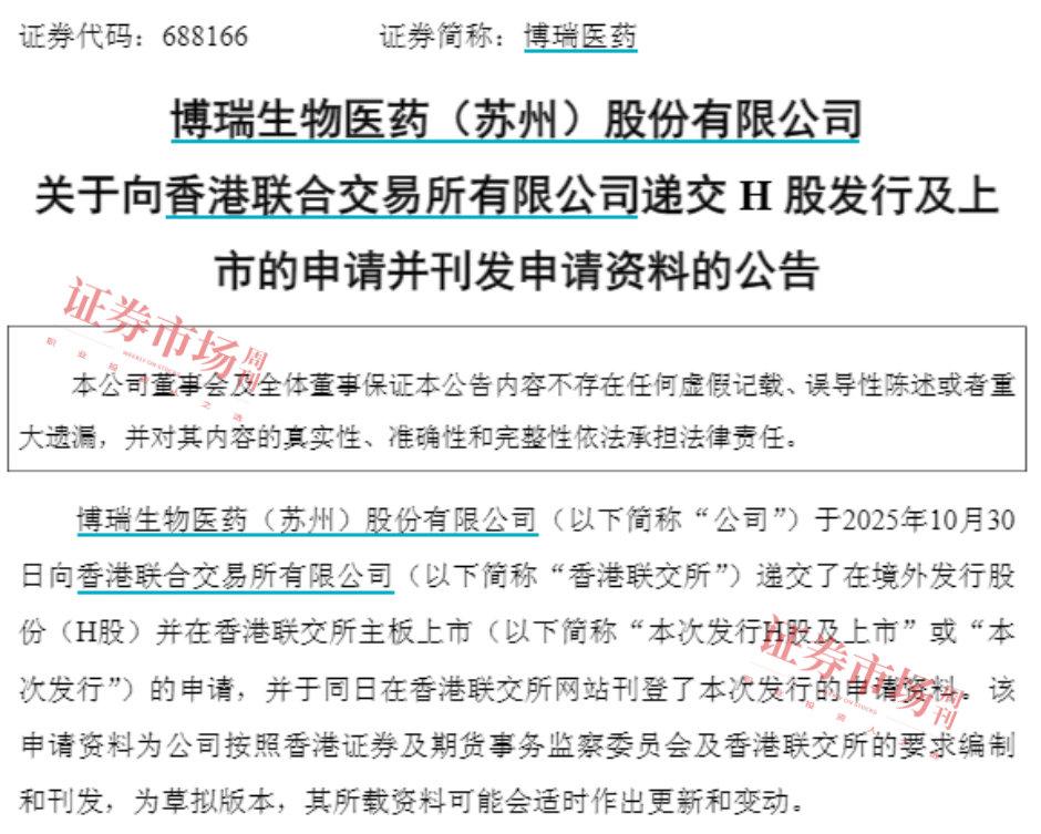10月30日晚间,A股上市公司博瑞医药(688166)发布正式提交港股上市申请的公告,拟实现“A+H”两地上市。