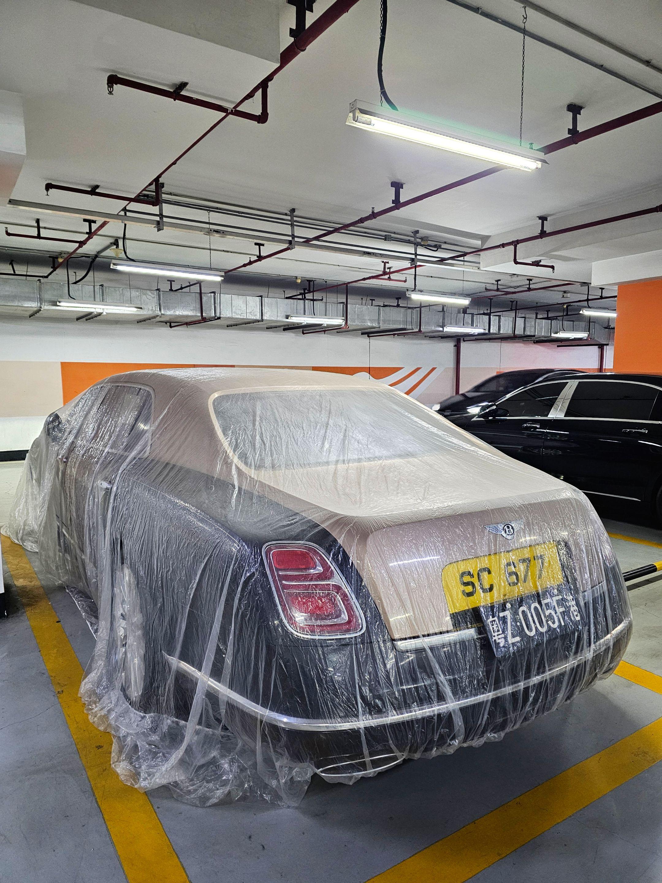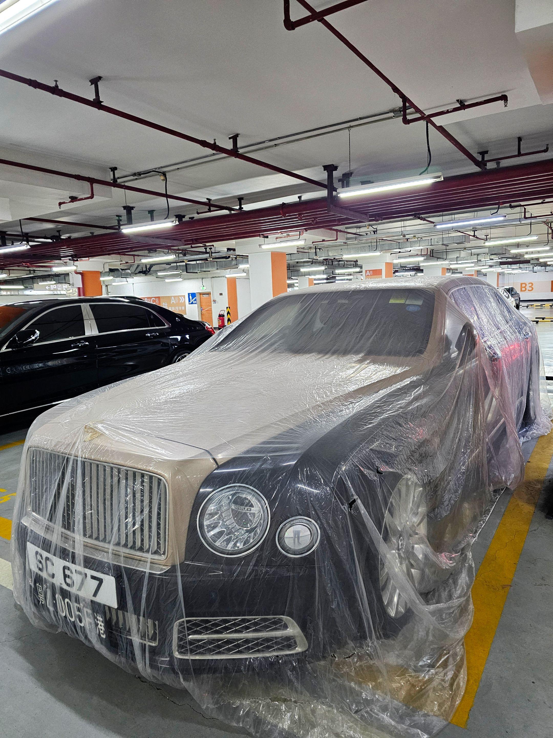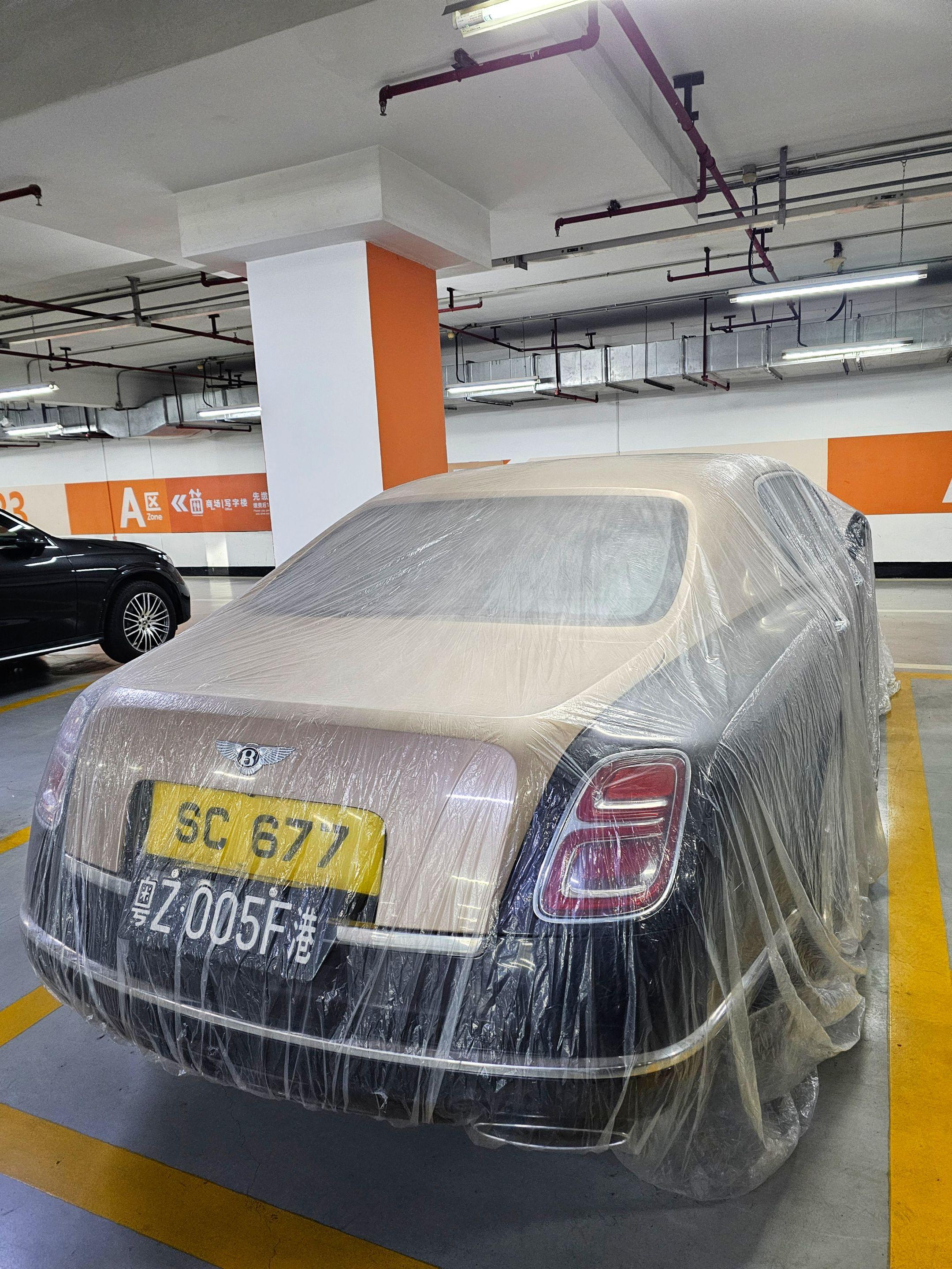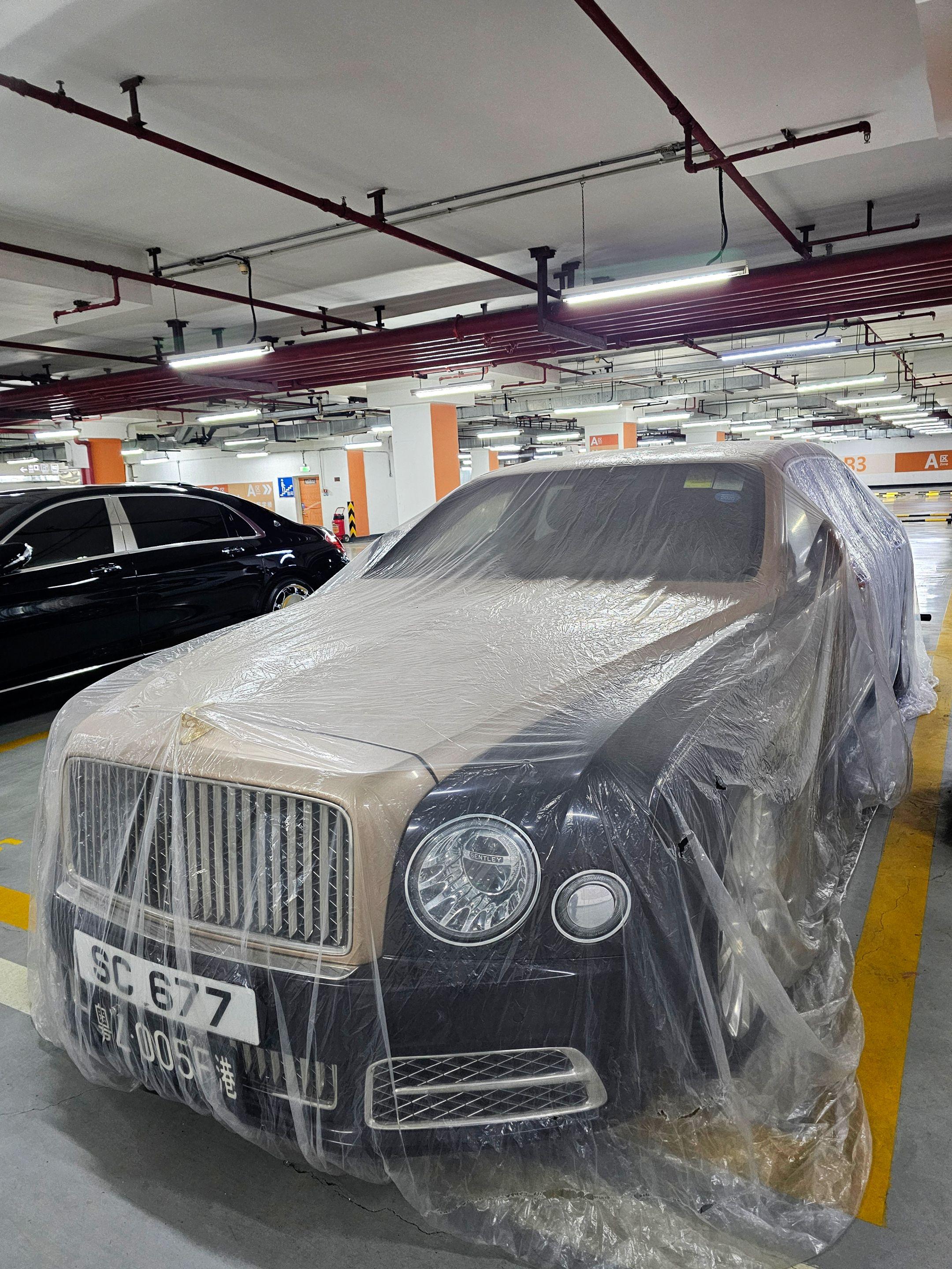 在广州某地库偶遇香港大佬座驾宾利慕尚加长,双拼色的外观金色宾利标优雅霸...