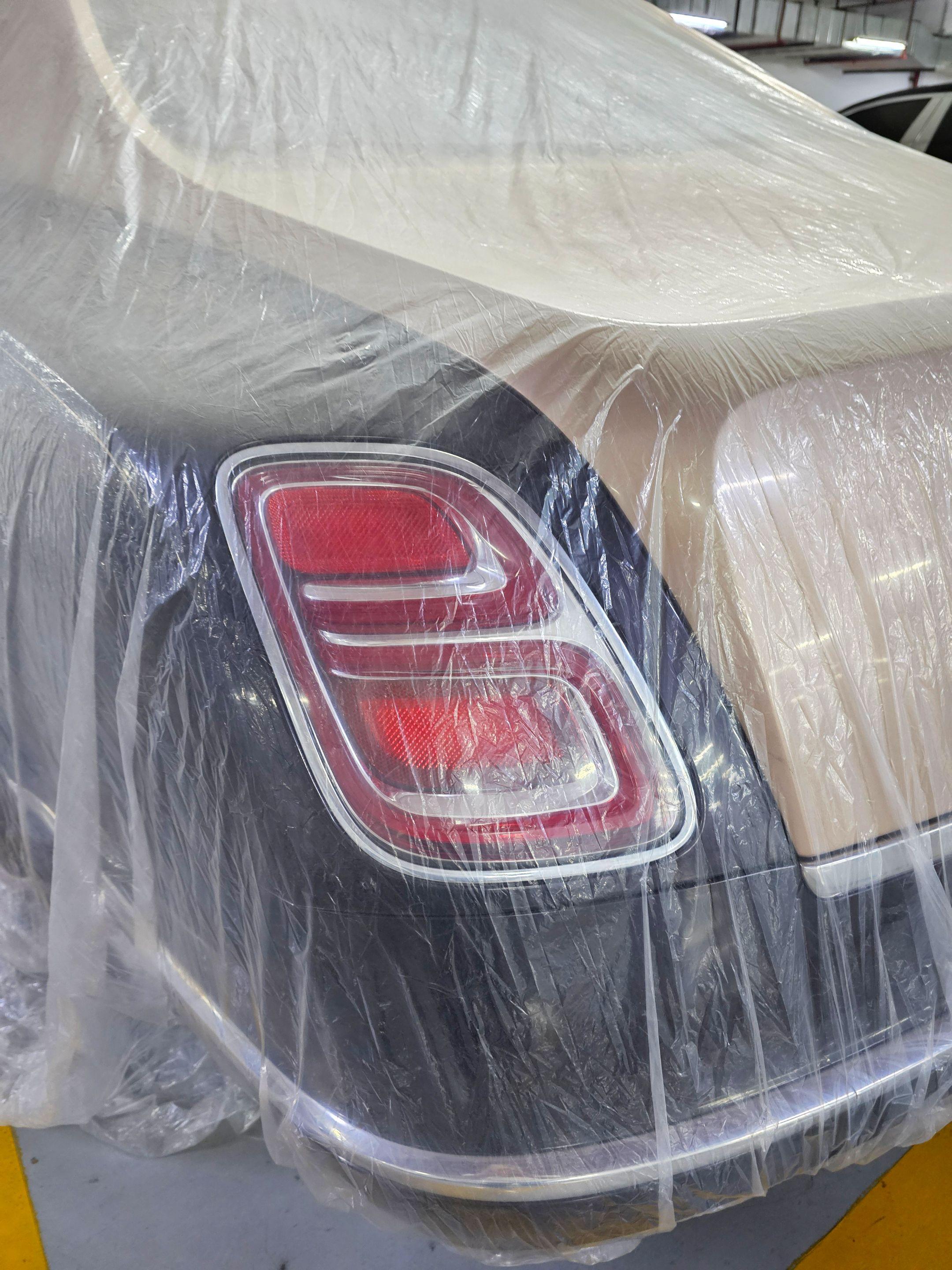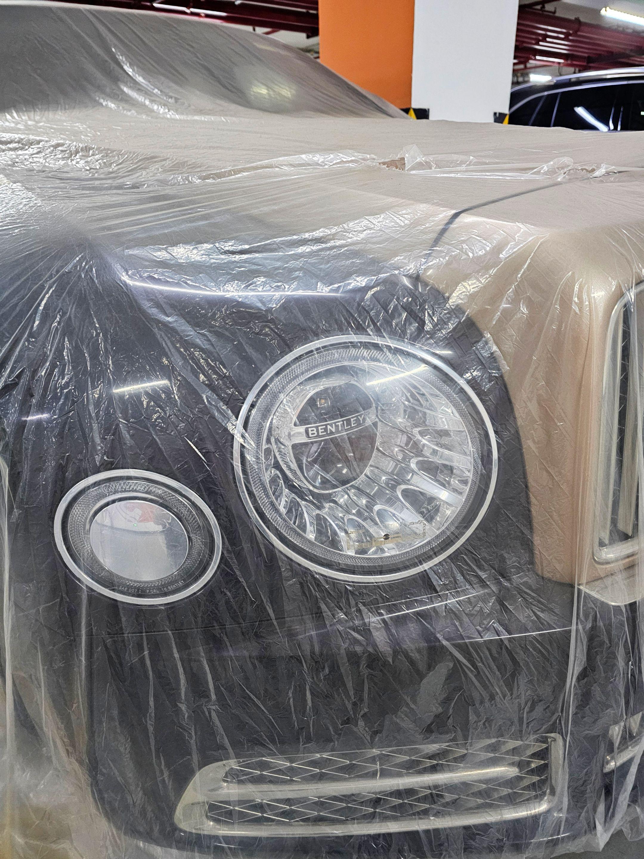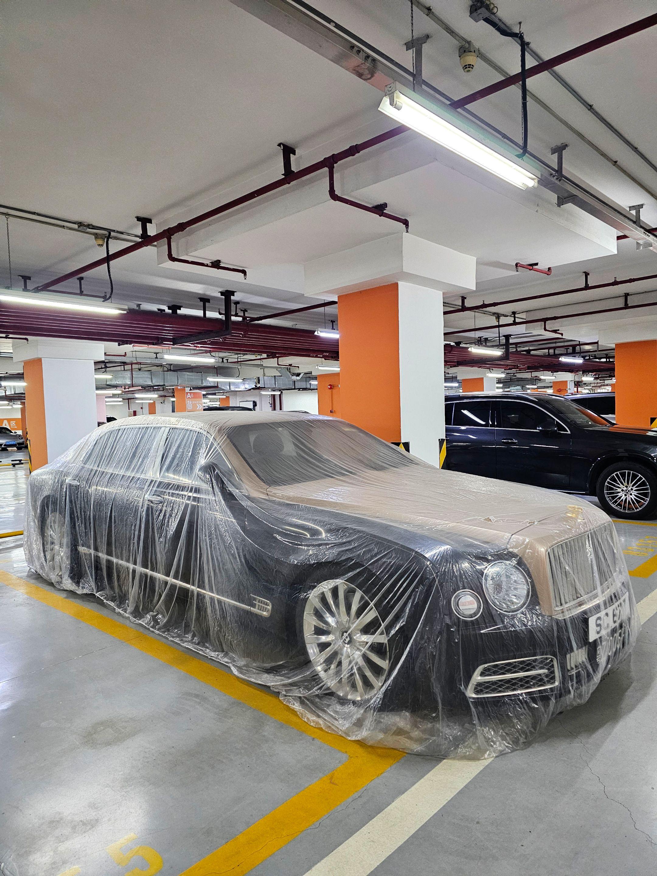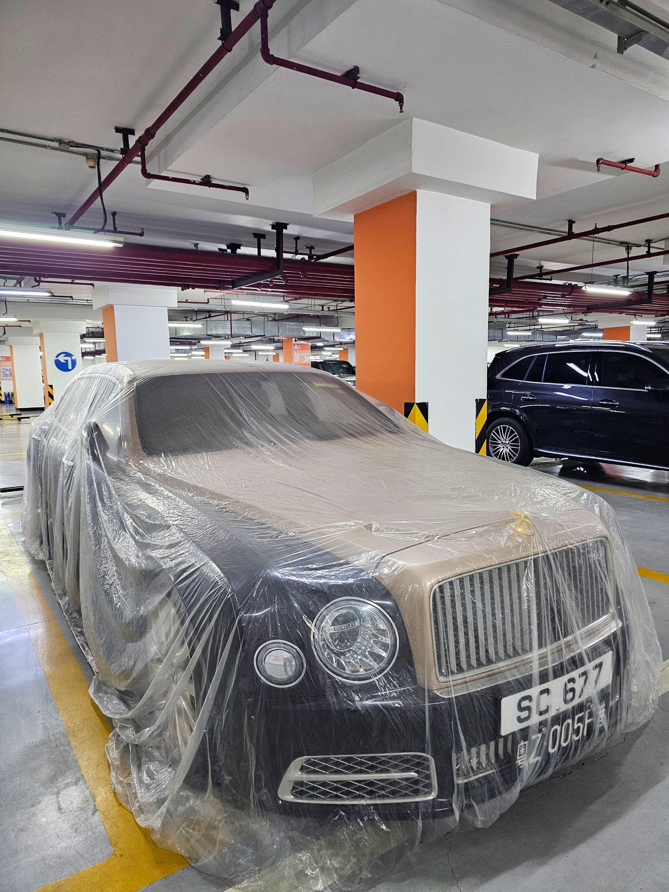 在广州某地库偶遇香港大佬座驾宾利慕尚加长,双拼色的外观金色宾利标优雅霸...