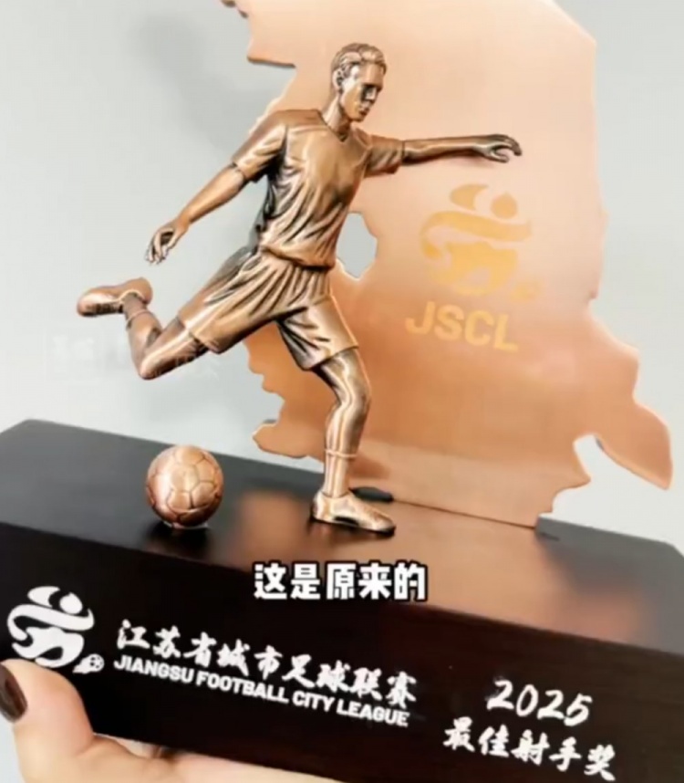 南京队滕帅和宿迁队高驰以9粒进球并列“苏超”射手榜第一,获得最佳射手奖。没想到刚过去一周,奖杯就已经被儿子弄坏。对此,网友调侃:“高驰的奖杯真成唯一了。”