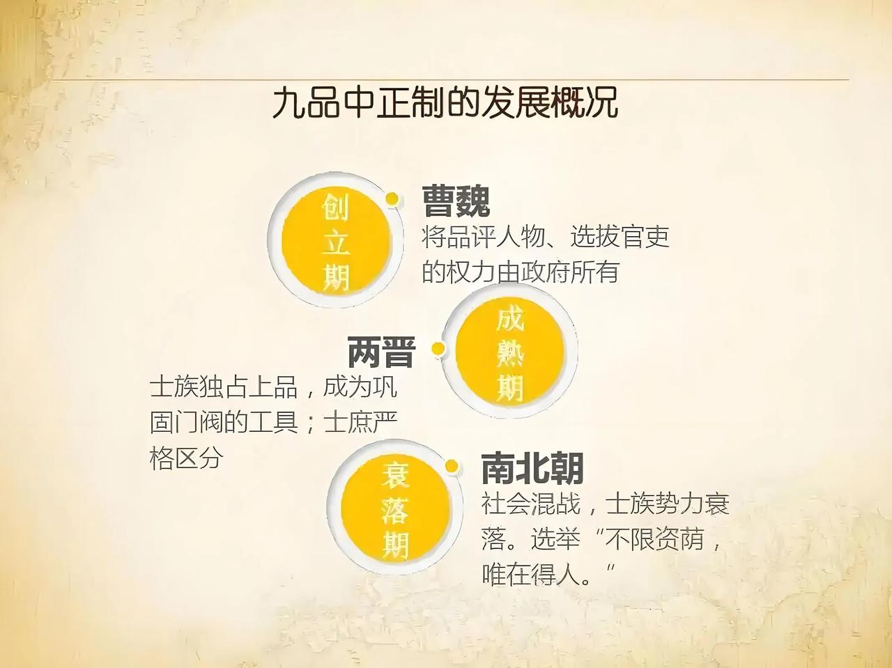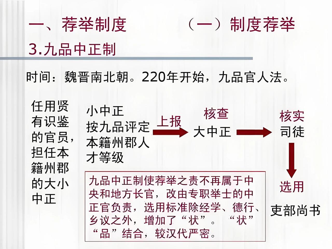大家好,我是你的历史人物科普博主!今天带大家走进一段鲜为人知但极具影响力的中国古代官员选拔制度——九品中正制。这一制度不仅深刻改变了古代官场的格局,也对后世的官员选拔方式产生了深远影响。让我们一探究竟! 九品中正制,起源于东汉时期,由名臣曹操在魏国推行,后来被曹魏历史 、晋朝、南北朝等多个朝代沿用。它的核心思想是:通过一套较为科学的评判体系,将官员分为九个等级,从而选拔出合适的人才担任官职。 这个制度的最大特点是“以人品为依据”,而非仅仅依靠科举或家族背景。官员的品级从“上品”到“下品”逐级划分,品级越高,责任越重、待遇越优。 推荐与考察:地方官员或士人被推荐或自荐,经过中正官(负责评定品级的官员)严格考察。 品评打分:中正官根据被评者的品德、能力、忠诚度等多个方面打分,划分为九个等级。 公布结果:评定完毕后,官员的品级会被公示,用以决定其官职和待遇。 任用:品级高者优先被任用到重要岗位,品级低者则担任基层职位。 打破门第限制:在此制度之前,官员多依赖门第、关系,普通百姓难以入仕。九品制强调“品德优先”,让更多有才华的平民有机会进入官场。 稳定官员队伍:通过科学评定,减少了贪污和徇私舞弊,官员素质得到了保障。 制度影响深远:九品制为后世科举制度的建立奠定了基础,也影响了中国官员选拔的公平性。 当然,九品中正制也不是完美无缺的。它在实际操作中容易受到推荐人私心、偏见的影响,导致“以人废言”的现象。同时,过于依赖品级也可能导致官员“官本位”,忽视实际能力。 尽管存在不足,但九品中正制在中国古代官员选拔史上具有划时代的意义。它推动了官员选拔的制度化、科学化,为后世科举制度的完善提供了宝贵经验。 想象一下,没有这套制度,古代的官场会变成什么样?也许我们今天的公务员体系还会停留在“门第优先”的时代!