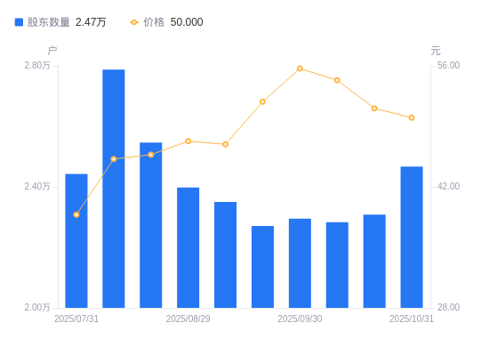 近一年(2024年10月31日至2025年10月31日),杰瑞股份A股股东户数从2.73万户,减低至2.47万户,降幅9.50%,区间股价上涨52.02%。