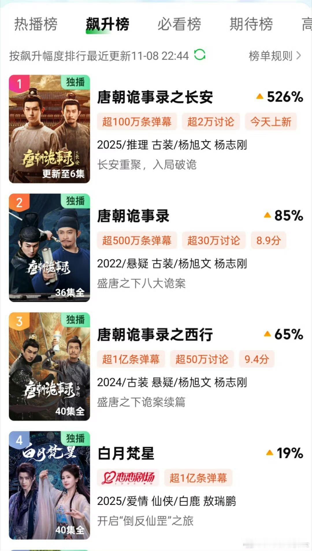 唐朝诡事录热度 首日播出,大事很妙。热度到现在依旧在涨,已经8700+,没有横盘[耶]