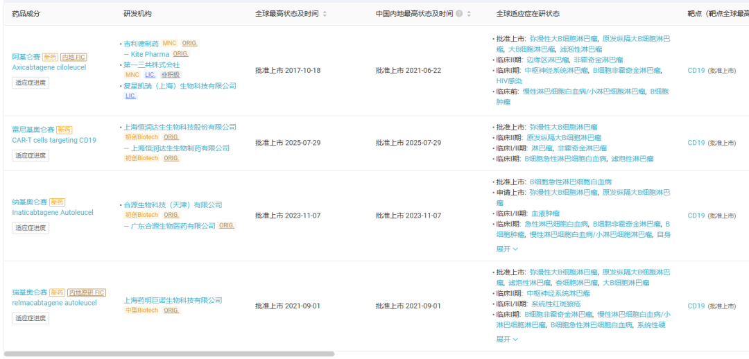 根据Insight数据库,此前国内已有4款靶向CD19的CAR-T产品获批上市,分别为复星凯特引进的的阿基仑赛、药明巨诺的瑞基奥仑赛、合源生物的纳基奥仑赛,以及恒润达生的雷尼基奥仑赛。重庆精准生物的普基仑赛是国内获批的第5款CD19CAR-T产品。