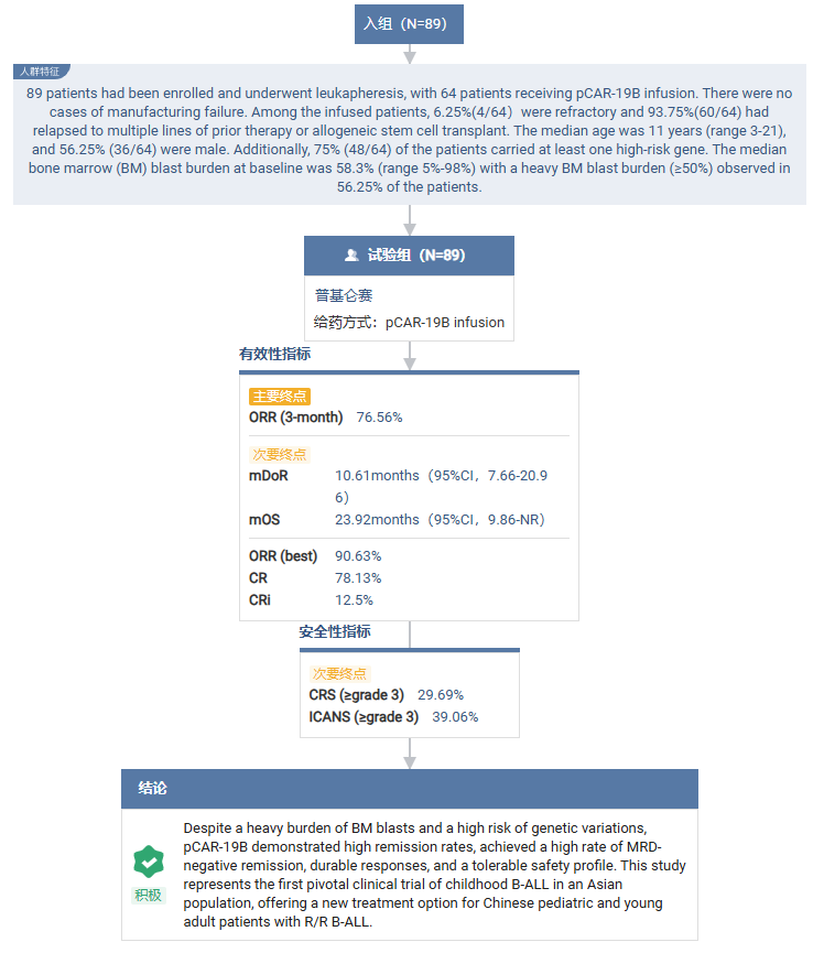 截至2024年4月18日,共入组89例患者并接受白细胞分离术,其中64例接受pCAR-19B输注。无制备失败病例。在输注患者中,6.25%为难治性,93.75%的患者复发,需接受多线治疗或异基因干细胞移植。患者中位年龄为11岁(范围:3-21岁),56.25%为男性。此外,75%的患者携带至少一种高危基因。基线骨髓原始细胞负荷中位数为58.3%,56.25%的患者骨髓原始细胞负荷较高(≥50%)。