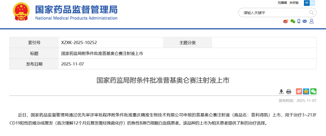 11月7日,NMPA官网宣布已于近日批准重庆精准生物申报的1类生物新药普基仑赛注射液(pCAR-19B细胞自体回输制剂)上市,用于治疗3~21岁CD19阳性的难治或复发(首次缓解12个月后复发需经挽救化疗)的急性B淋巴细胞白血病患者。此前,该药曾被CDE纳入突破性治疗和优先审评。