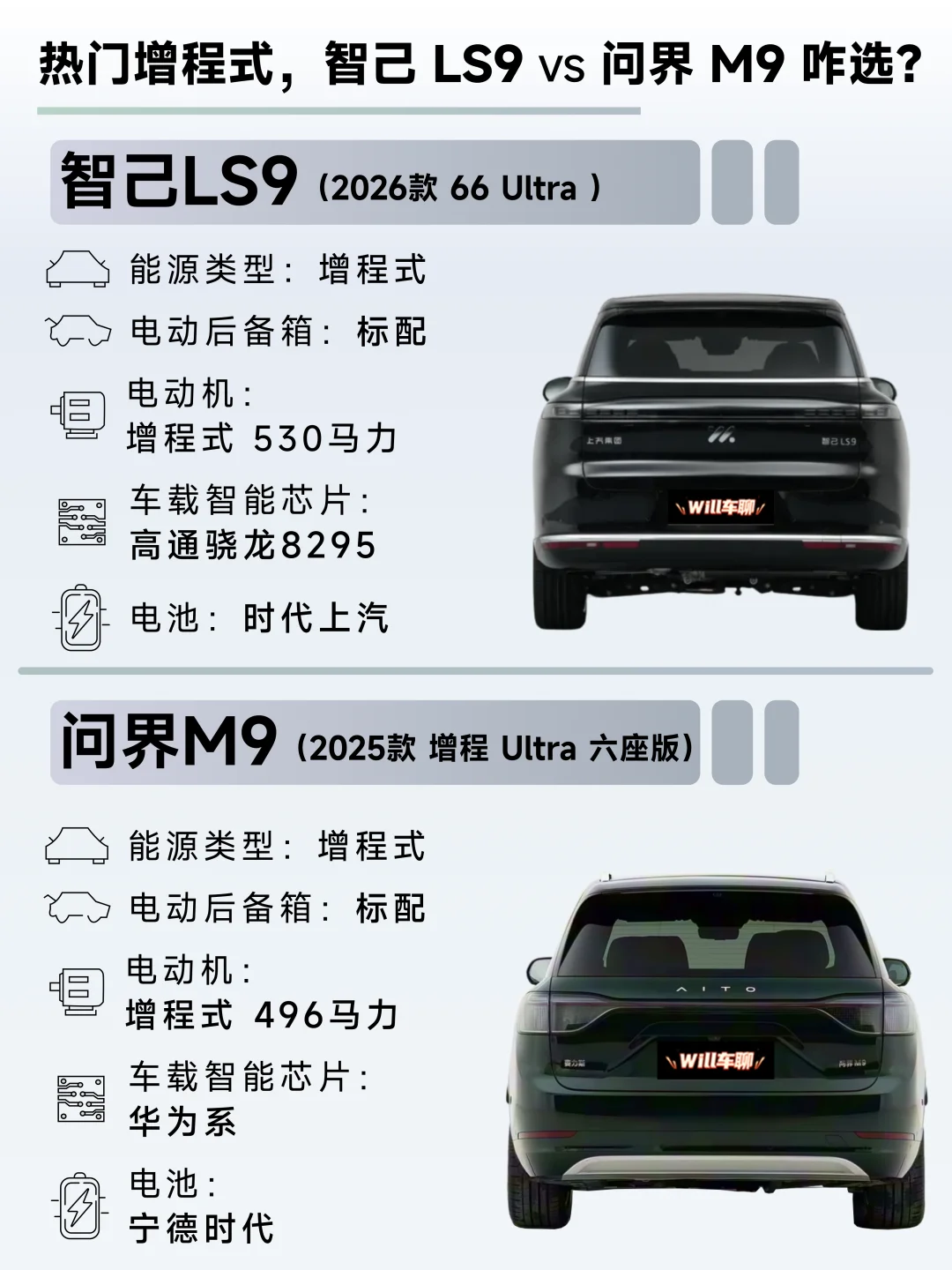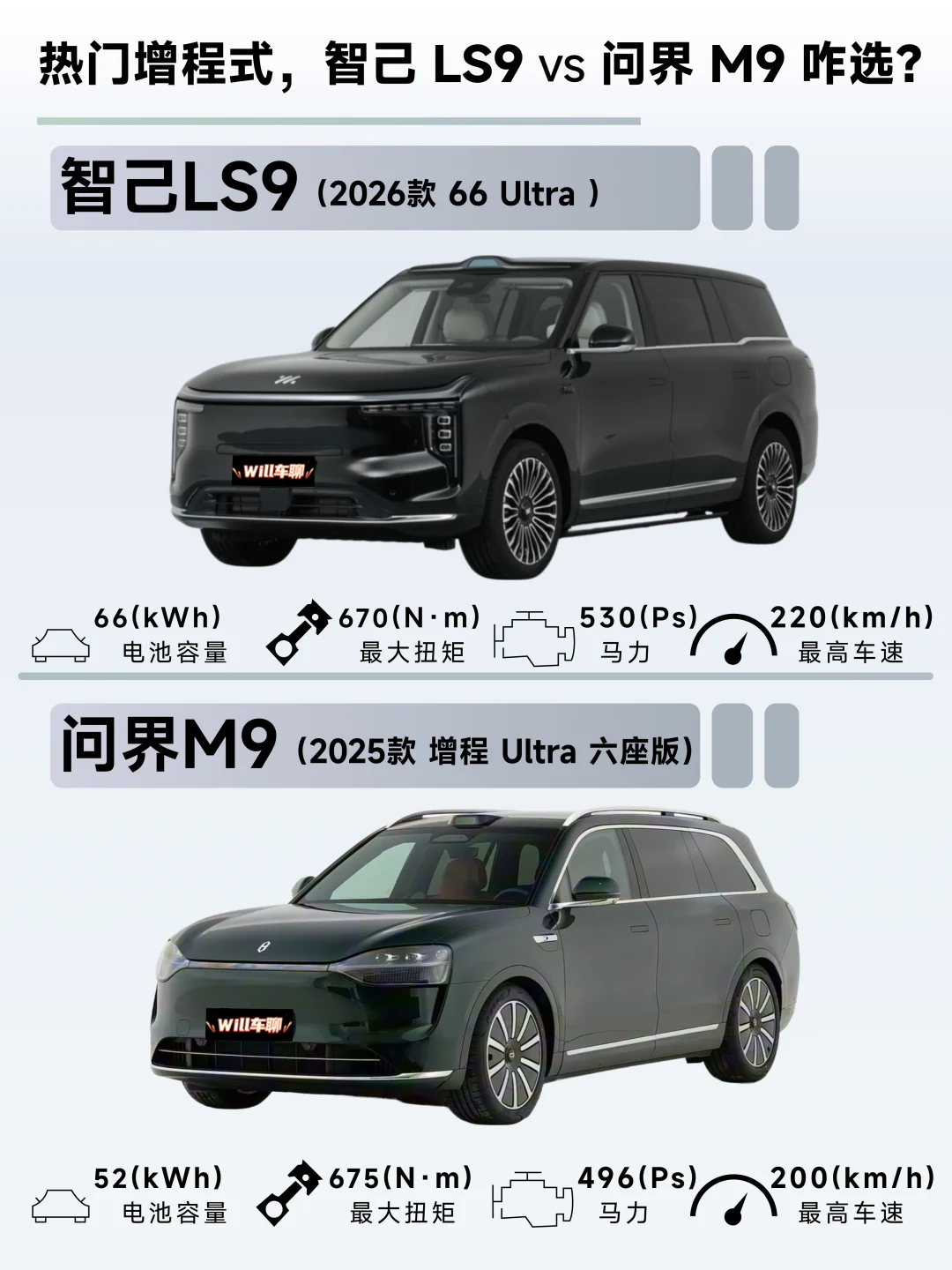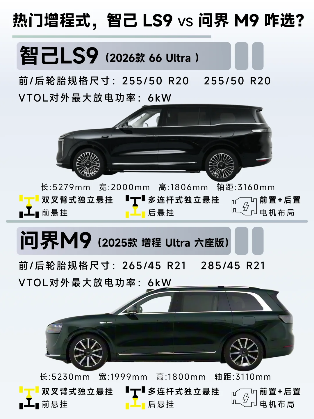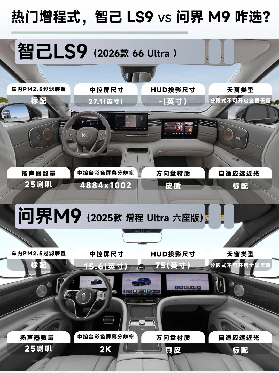 最近在大六座 SUV 圈纠结的宝子看过来! 智己 LS9 2026款 66 Ultra 和问界 M9 2025款 增程 Ultra 六座版这两款Ultra版的旗舰车型,风格差异还真不少,今天咱们客观聊聊,帮你找准心头好~ 先看价格💰,智己 LS9 预售价 36.69 万起,问界 M9 指导价 53.98 万起~两者相差十几万,但是尺寸两者却是相近。 空间方面📐,智己LS9 车长 5279mm、轴距 3160mm,比问界M9的 5230mm 车长、3110mm 轴距更宽裕,大家庭出行装人装物都更自在~ 动力这块🚗,智己LS9 零百加速4.9S、马力 530Ps;问界M9最大扭矩 675N・m,低速爆发力很足,零百加速5.1秒~ 智能配置各有亮点🤖,智己LS9 的 27.1 英寸中控屏视觉冲击力拉满,副驾屏15.6英寸;问界M9有 75 英寸 HUD 、16英寸副驾屏和华为系芯片,喜欢华为生态的宝子会更爱~ 基础配置上🎁,两款车都用了双叉臂+多连杆独立悬挂,滤震很稳;VTOL 对外放电功率都是 6kW,露营党狂喜,用电自由;电动后备箱、PM2.5 过滤、自适应远近光也都是标配,“安全感” 这块不分伯仲~ 总结一下:✅ 选智己 LS9:预算友好、动力强、空间大、大屏党狂喜! ✅ 选问界 M9:预算充足、更看重华为智驾 / 生态、HUD 的科技感拉满!回头率十足! 两款都是同级别实力派,智驾均支持城区NOA,智舱也是满配,朋友们根据自己的预算、用车场景、科技偏好冲就完了!