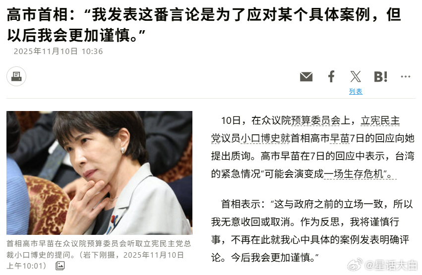 关于朝夕新闻报道的,11月10日,高市早苗称“我发表这番言论是为了应对某个具体案例,但以后我会更加谨慎。”