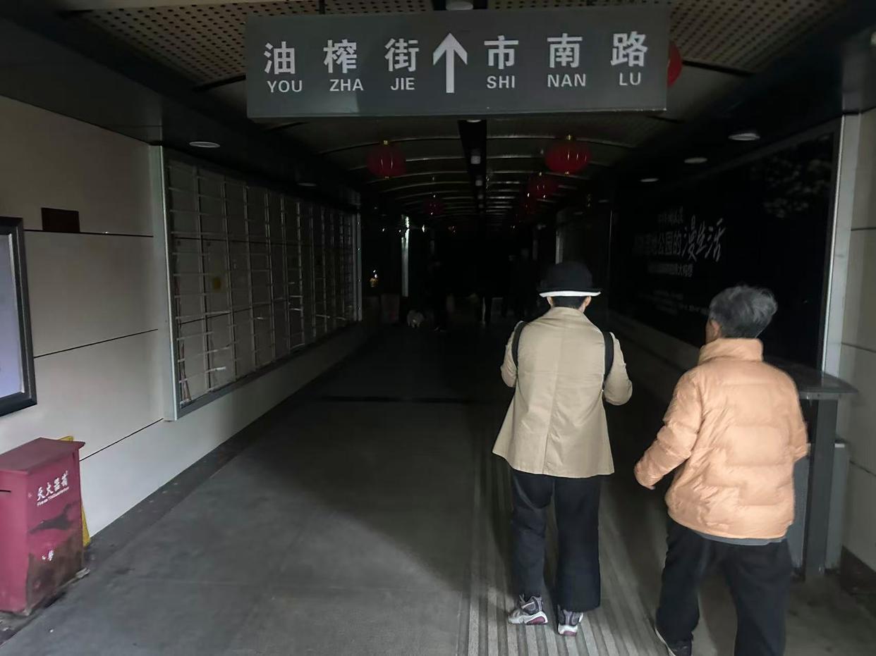 记者发现,过往的几乎都是老年人,并且大多数都没有带手机出门,所以无法开电筒照明。在地下通道里,有一位工作人员拿着手电筒给大伙儿照亮,但效果并不理想。