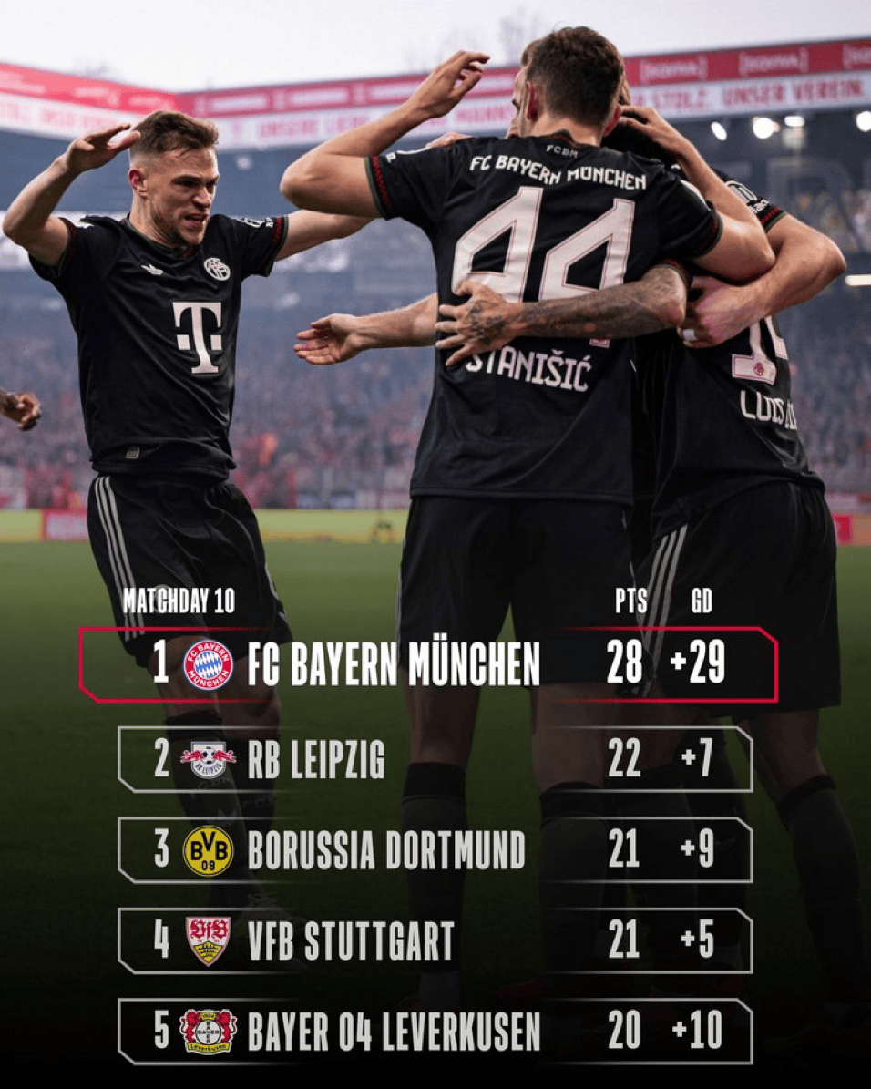 拜仁官方晒德甲积分榜:尽管战平,领先优势依然扩大
