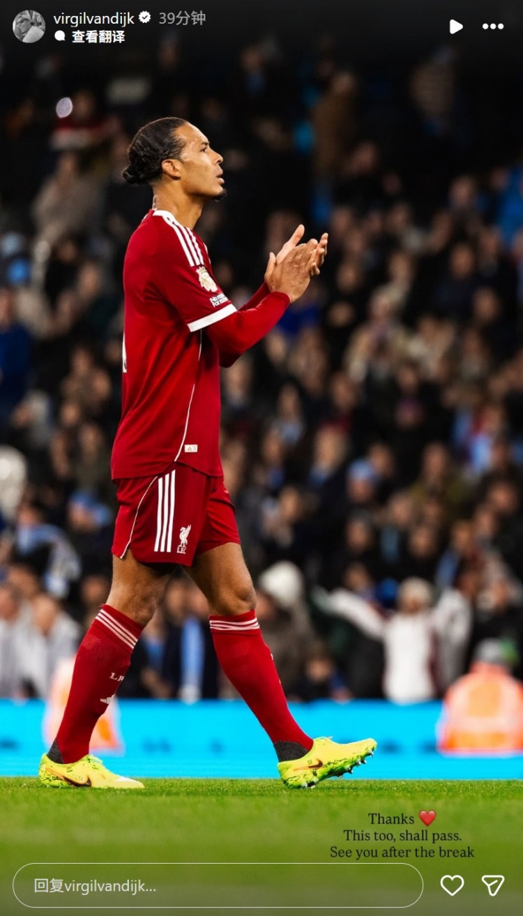 本场比赛范戴克首发出战,他也在个人社媒晒照鼓励球队,写道:“感谢支持,一切都会过去,我们国际比赛日后再见!”