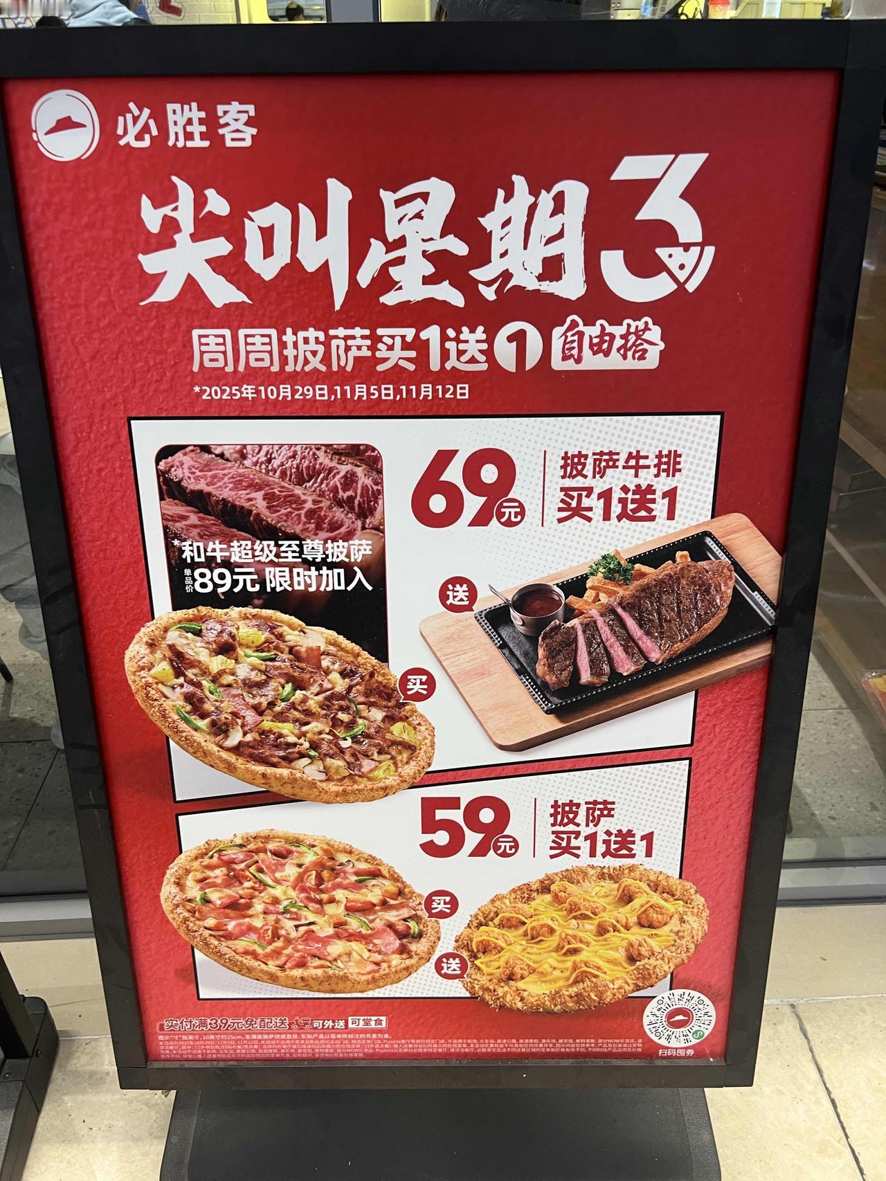 必胜客披萨 最早吃的披萨就是必胜客的,印象中以前必胜客披萨店有很多,大的商场里几乎是标配,而且属于比较贵的快餐,但后面棒约翰、达美乐都开始推广竞争,感觉见到的必胜客店越来越少。 好久没有吃过必胜客,前几天从直播平台购买了张券,79块钱可以自选6样,包括一大一小两个披萨,披萨价格比以前印象中的低了好多,到了店发现门口还有疯狂星期三59元披萨买一送一活动。 可能现在必胜客开始转变思路走大众性价比线路,店面面积也一样,从大面积转向小成本。不大的一个店面,能坐下不到30个人,不过生意不错基本坐满了,多是带着孩子来的家庭。店面只有一位阿姨在忙前忙后的收拾,后厨差不多有三四个人在忙着制作。使用购买平台的券,要到了店里微信扫店里的点餐码才能找到使用,怪不得前面怎么也找不到使用的地方。 披萨小食不到15分钟就都上来了,上的还是挺快的,披萨应该是现烤现做,吃起来还不错,不过记不起来原来的味道是什么样子了。现在还有汉堡,下次来尝尝汉堡是什么味。