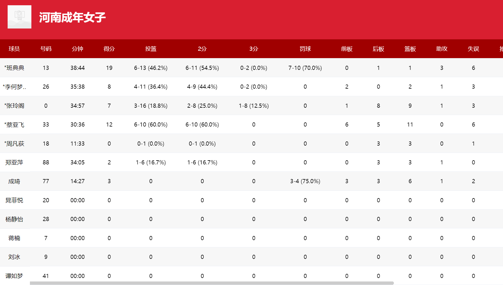 河南女篮:班典典19分3助,蔡亚飞12分11板,李何梦丹8分。