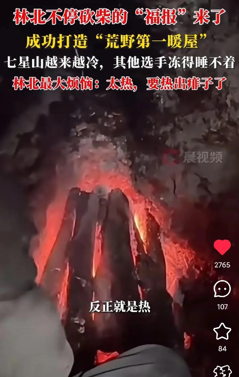 笑不活了!林北真的特有仪式感 ,遇到特殊日期就想退赛,这回想在第38天退赛,那天正好是他生日,想回去和家人过生日,算是成全自己,正好26岁生日。 当然,还有一个前提,就是如果他正好是11名的话,他退赛,别人就正好进决赛了,换言之,假如他在10名以内,也许就不会退了。 官方应该不会让他退,因为他太有趣了,收视率都靠他了 而他之前不停砍柴的福报也来了,别人都冷的要命,他这里特别热,一会脚热,一会头热,都要热出痱子来了。 仔细观察了一下,感觉他应该是不会封火,他这个火其实有点问题,烧的太快,所以他需要一直搞柴火,并且是那种粗大的。 他要是能调整一下,控制一下燃烧速度能省很多柴。 而且他这个洞挺好的,不会漏雨,烧火的时候而且可以吸收和反射热量,适当改造一下最好了。