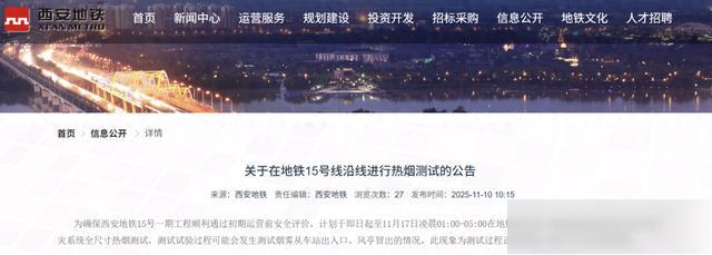 为确保西安地铁15号线一期工程顺利通过初期运营前安全评价,计划于即日起至11月17日凌晨1:00-5:00在地铁15号线一期线路沿线部分站点进行防灾系统全尺寸热烟测试,测试试验过程可能会发生测试烟雾从车站出入口、风亭冒出的情况,此现象为测试过程正常现象,请广大市民切勿恐慌。