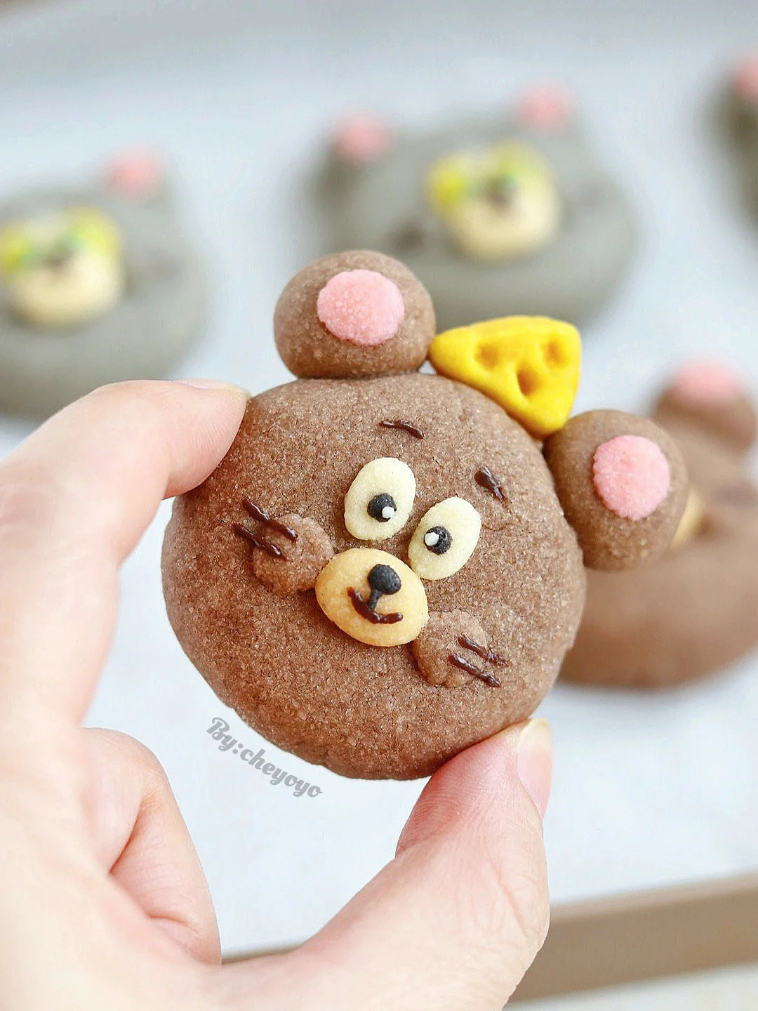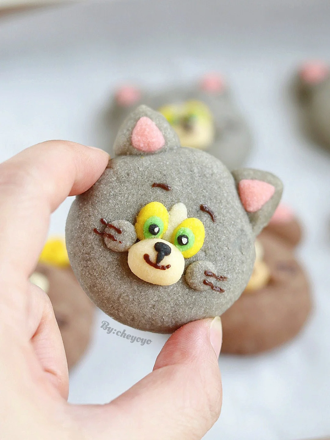 5⃣️ 出炉冷却后用巧克力画上胡须、眉毛,用白巧克力画眼睛高光就可以啦😌
