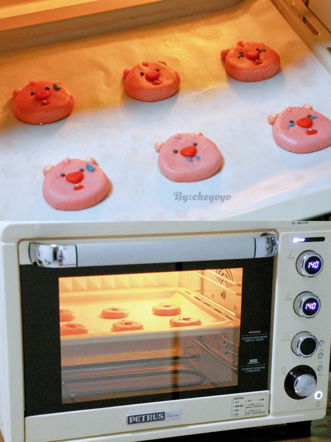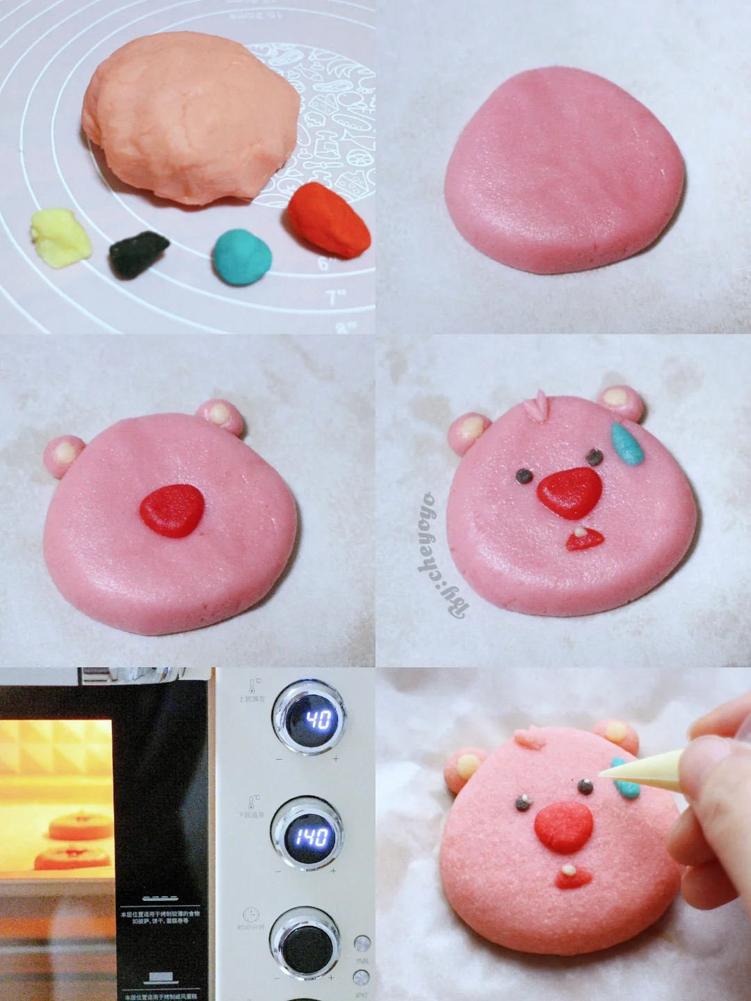 5⃣️ 出炉冷却后用白巧克力画眼睛高光,红曲粉画腮红就可以啦😌😌