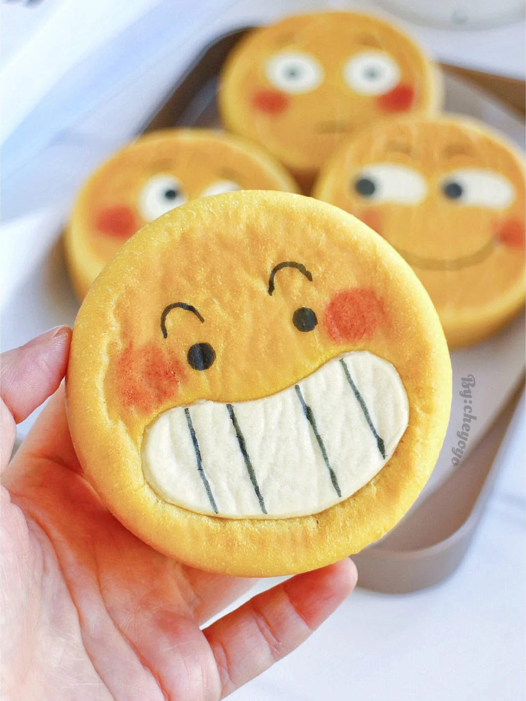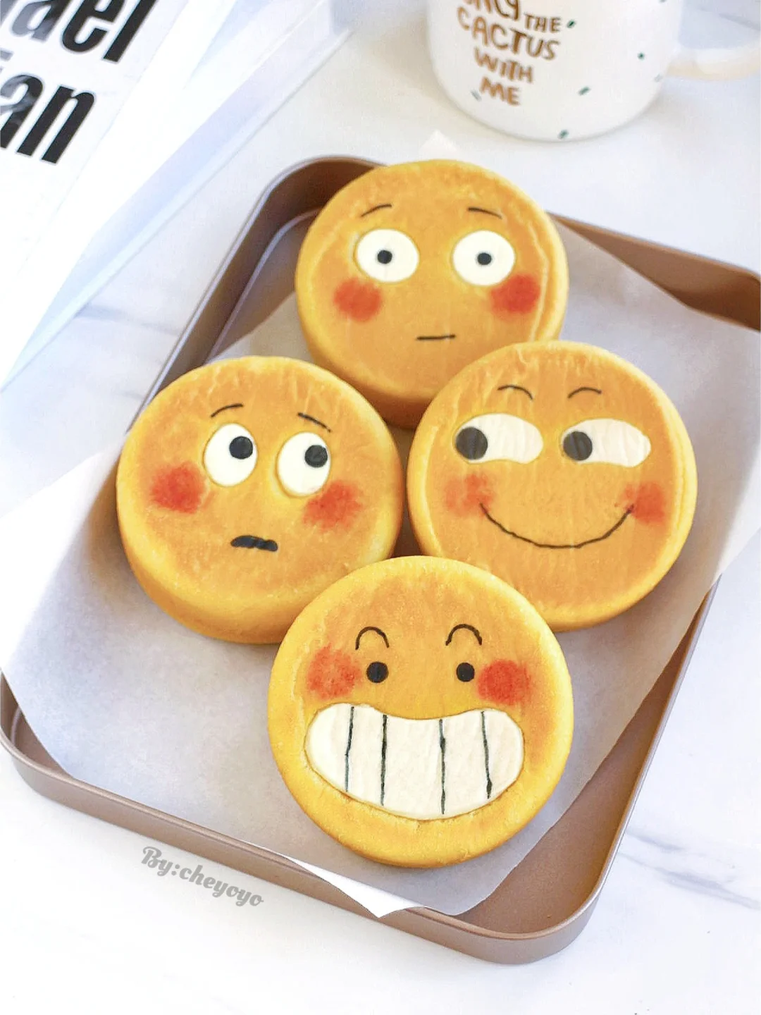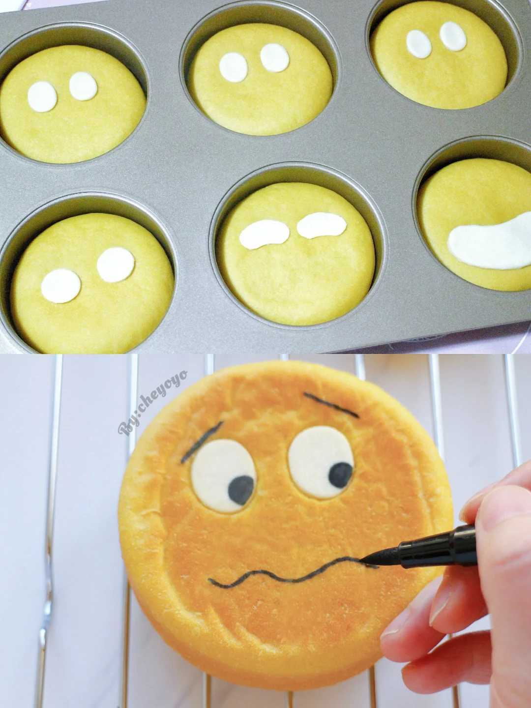 ⑦ 出炉脱模放晾网上冷却,用色素笔画上表情,用红曲粉画上腮红就大功告成了~😘😘