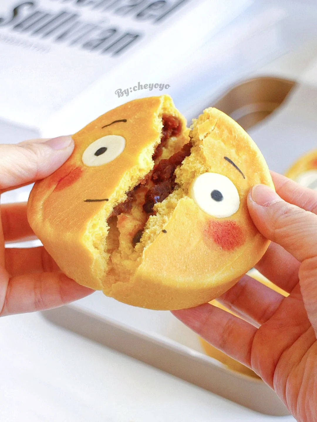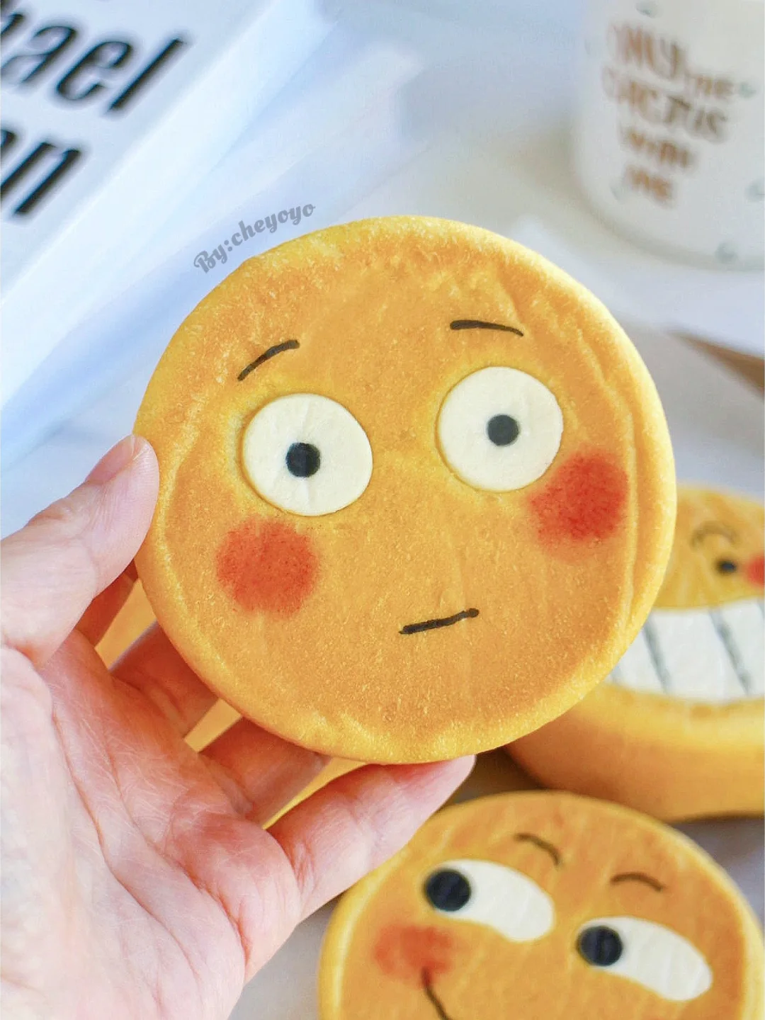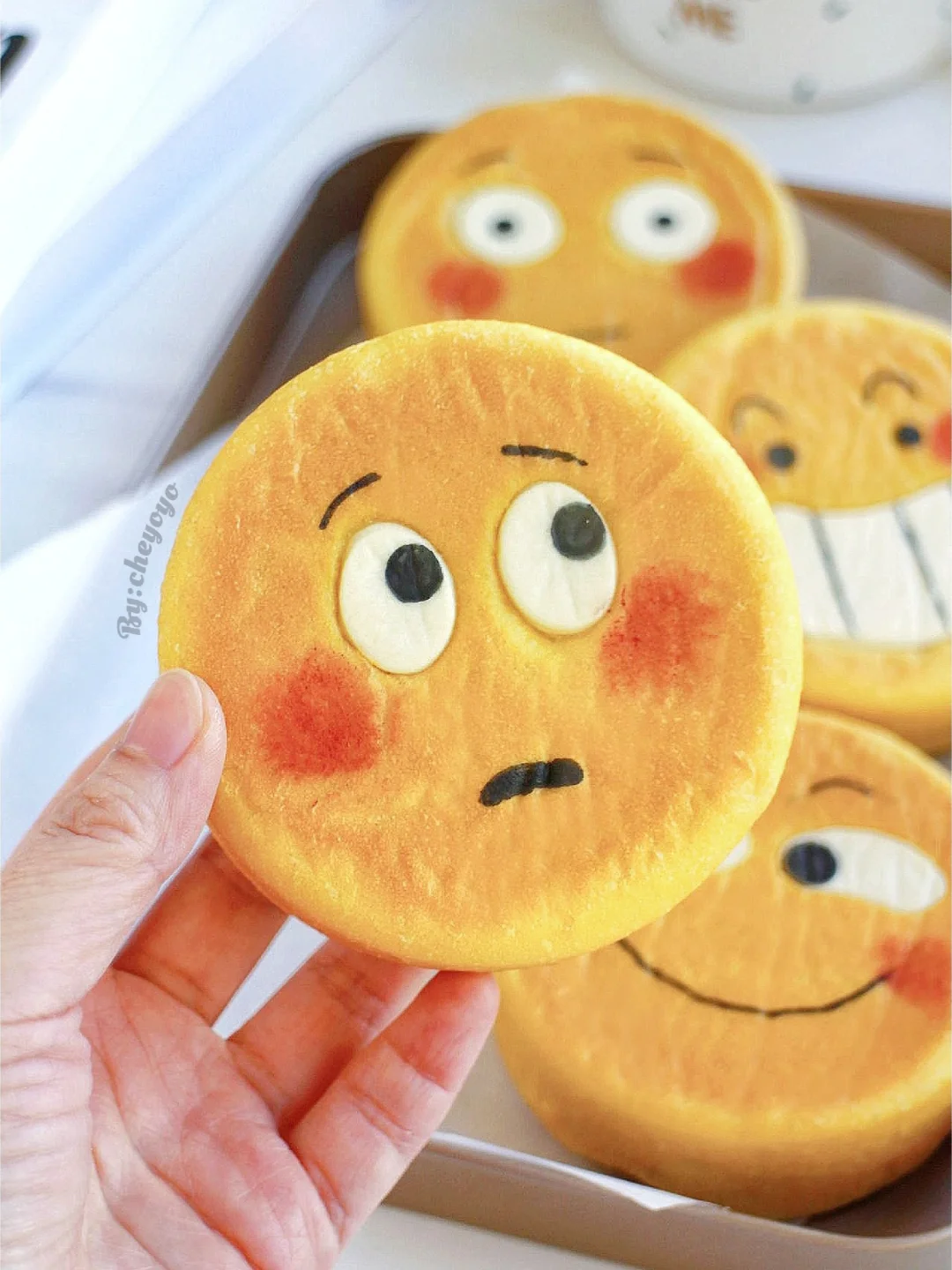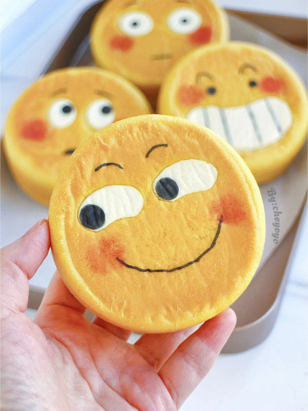 ⑦ 出炉脱模放晾网上冷却,用色素笔画上表情,用红曲粉画上腮红就大功告成了~😘😘