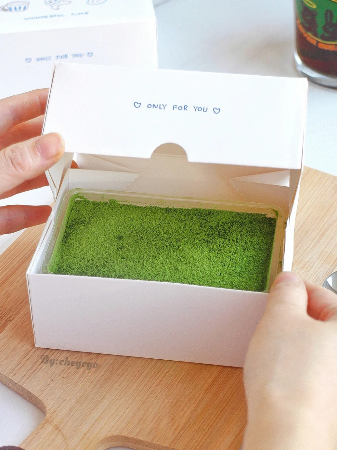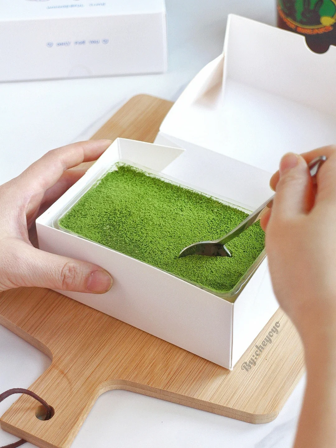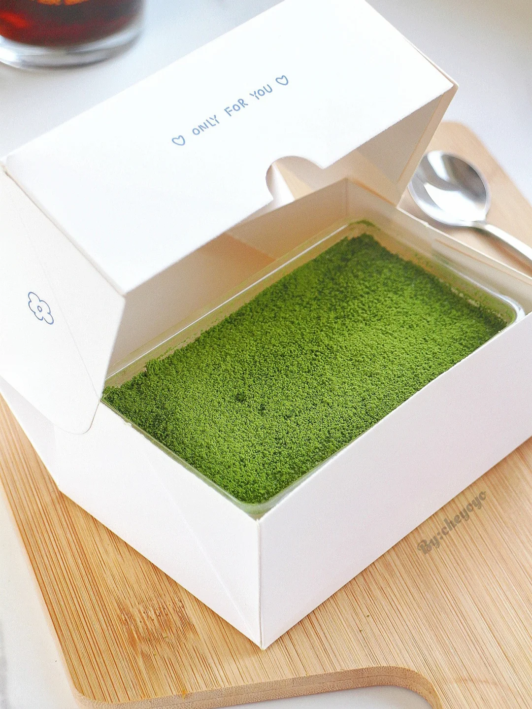 抹茶轻涩的苦味中和奶酪的甜腻,口感更轻盈更清新。这个方子的抹茶提拉米苏,可以做4盒(10.5*6.5*4.5cm)。包装盒是包礼包气的提拉米苏盒,手绘插画纸盒+带盖透明盒。
