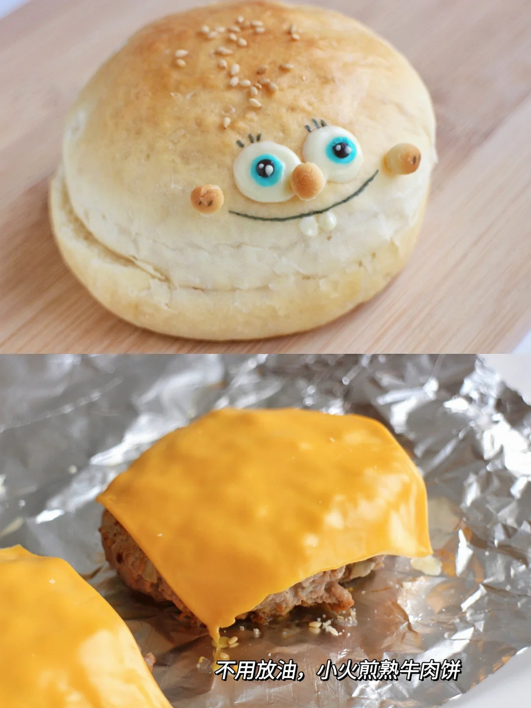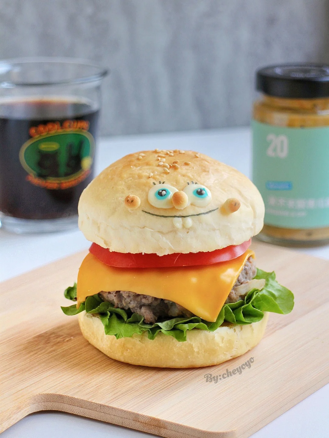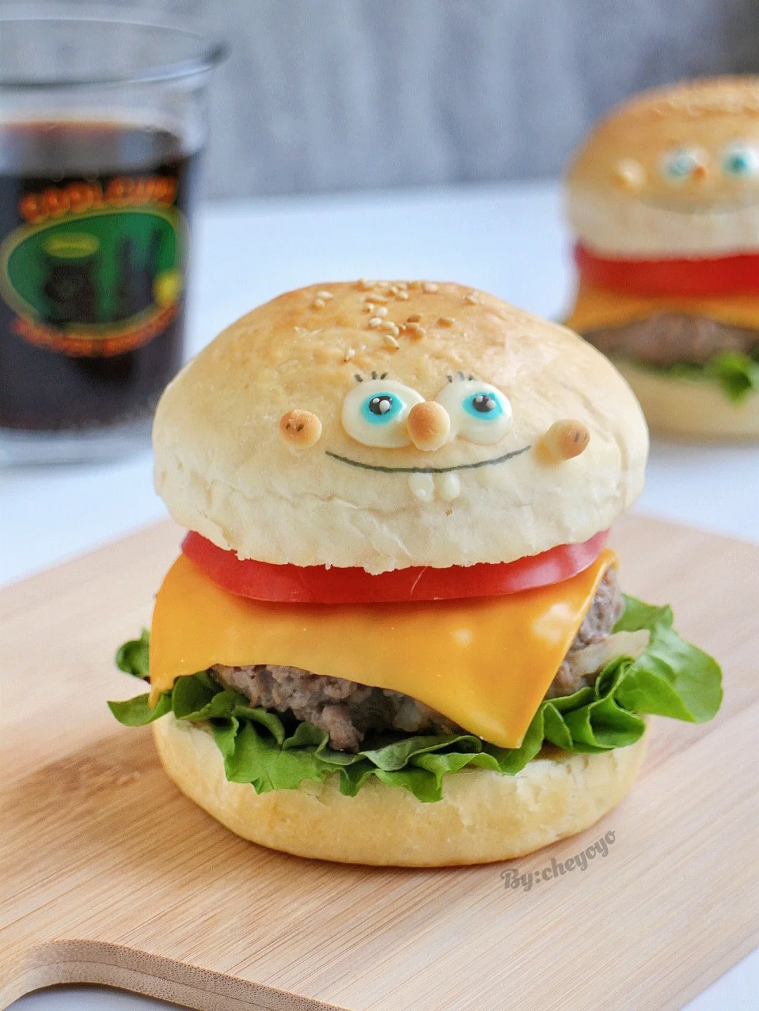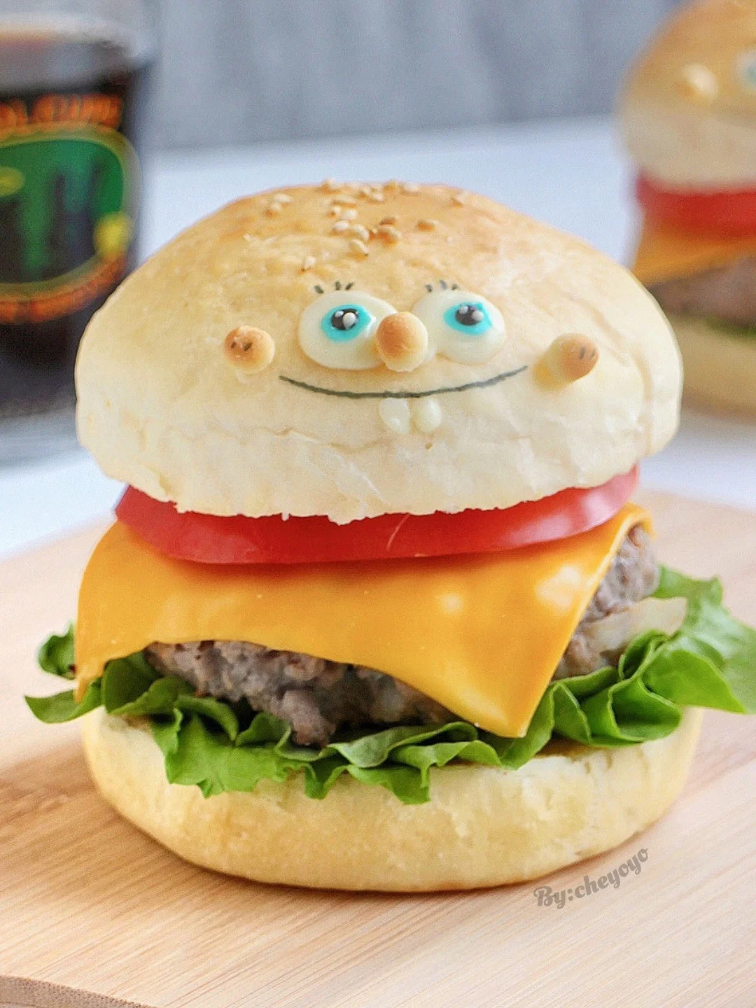 一口爆汁的芝士牛肉汉堡,配上爽口的冰镇可乐,真是超级满足‼️自制鲜嫩多汁的牛肉饼、蓬松柔软的汉堡胚、浓郁咸香的芝士、新鲜的蔬菜,营养健康,低脂低热量,当早餐真是再适合不过了!做成海绵宝宝的造型,真是可爱又好吃😋😋
