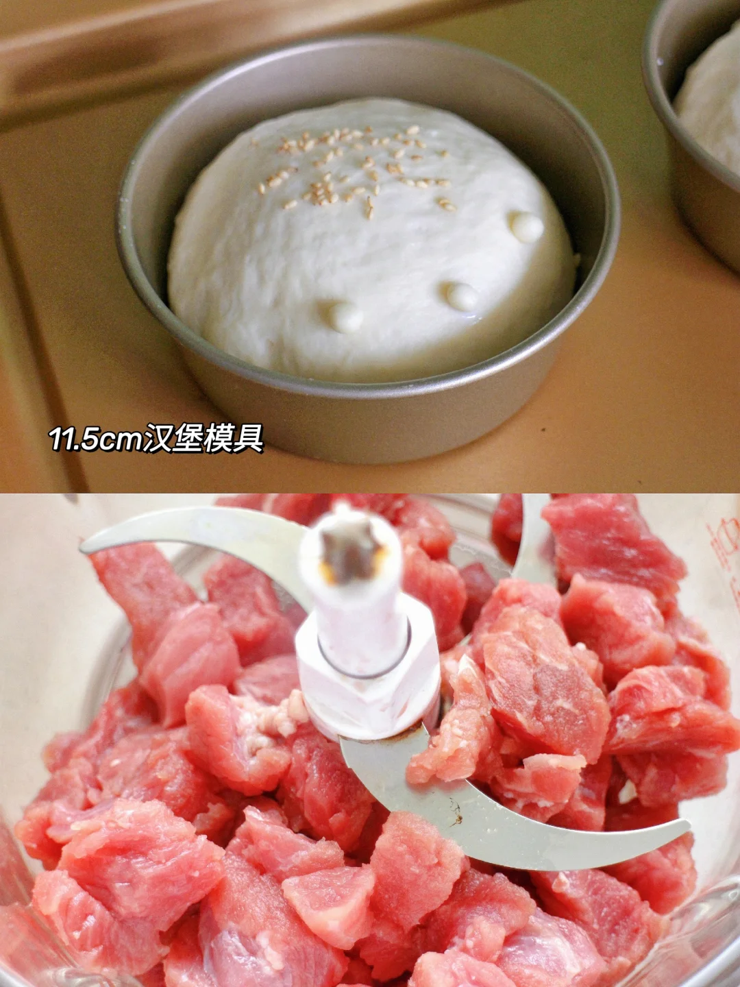 ❺ 二次发酵的时候开始制作牛肉饼!黄洋葱切碎,加少许盐腌半小时后挤出水份;牛肉用料理机打碎,加入姜末、鸡蛋、盐,用筷子顺时针方向快速搅打上劲,加入黄洋葱碎搅匀,均匀分成两份,压实做成肉饼;锅烧热(不用放油),放入肉饼小火煎熟一面后翻面,放上芝士片继续煎至成熟;