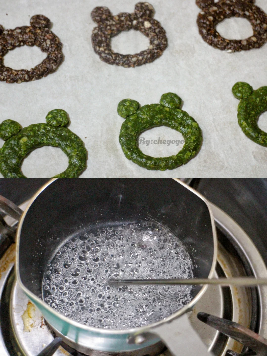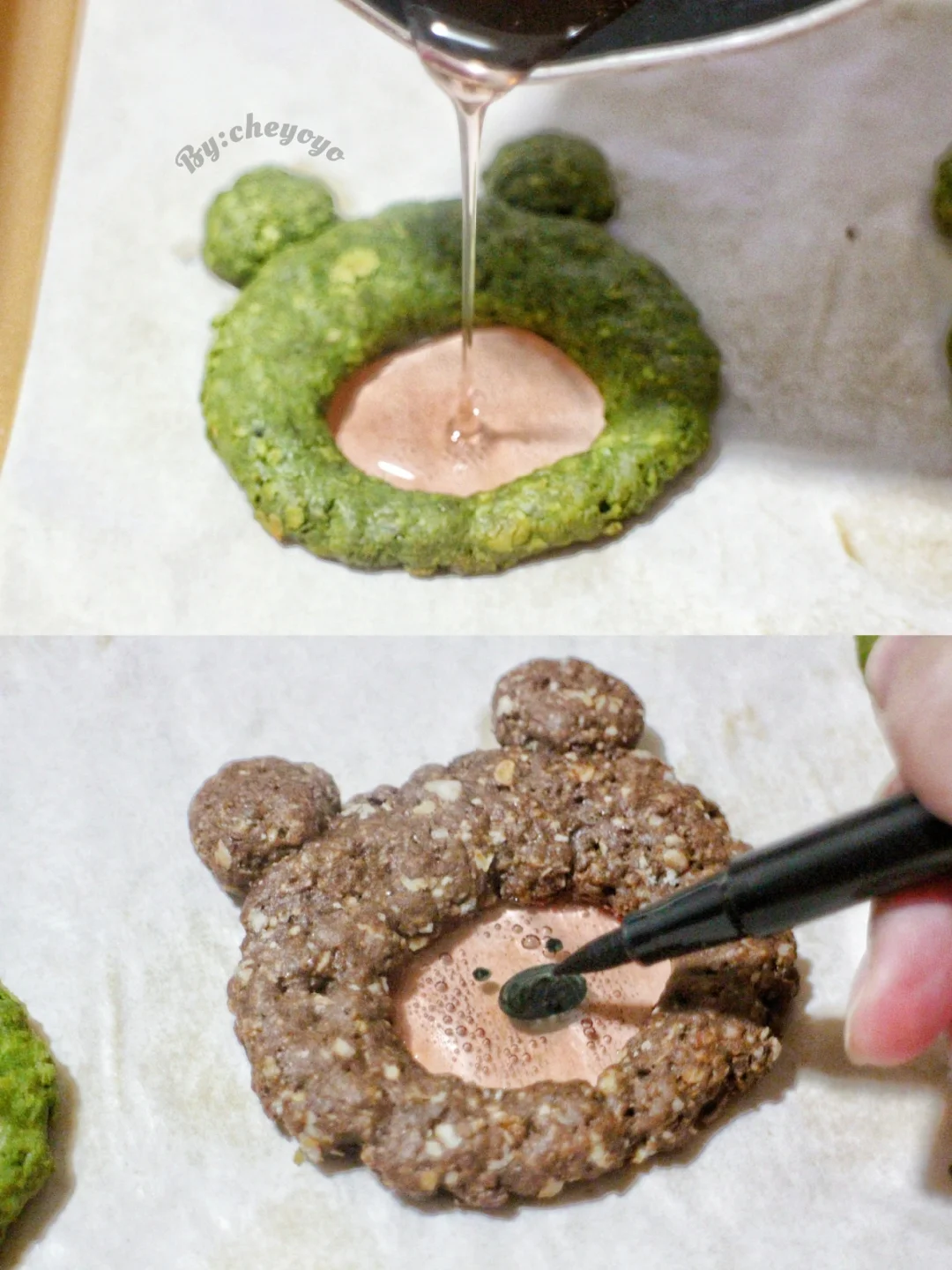 ② 椰子油和鸡蛋混合均匀,分别加入抹茶粉类和可可粉类中,翻拌拌匀后捏出造型,送入160度烤箱烘烤15分钟;