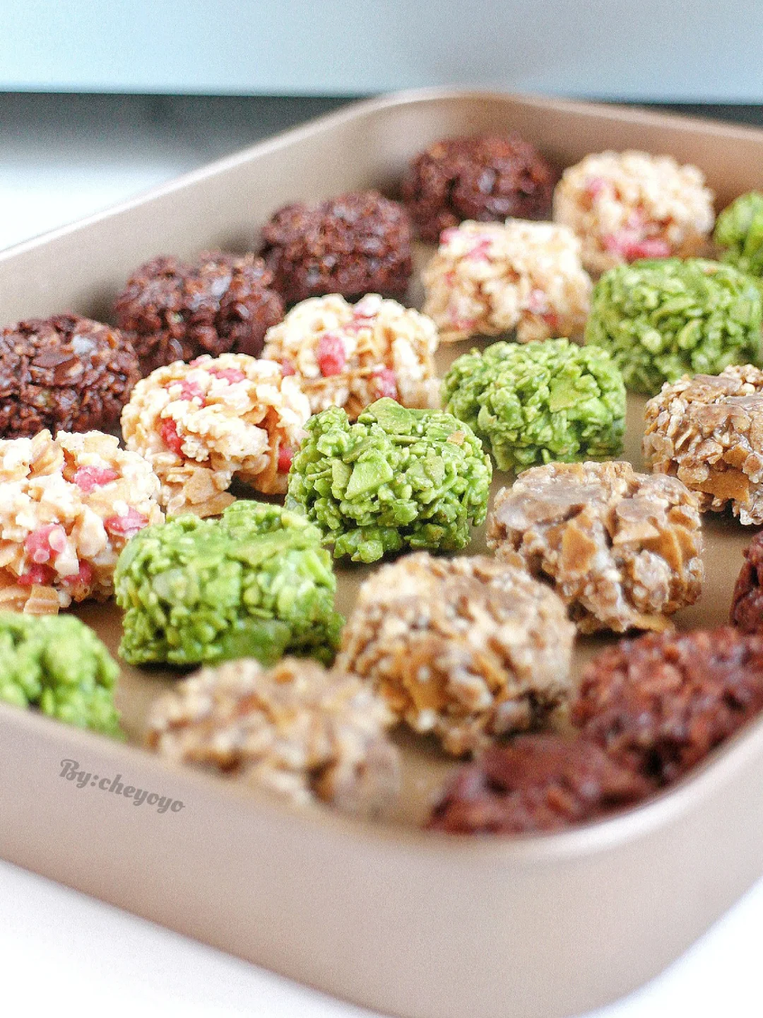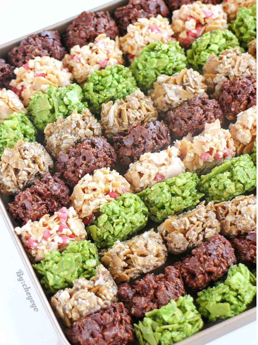 白巧克力、椰子油隔热水融化,加入抹茶粉搅拌均匀,加入脆燕麦、椰子脆片、黄油脆片翻拌均匀,装入模具中压实冷冻半小时后脱模。