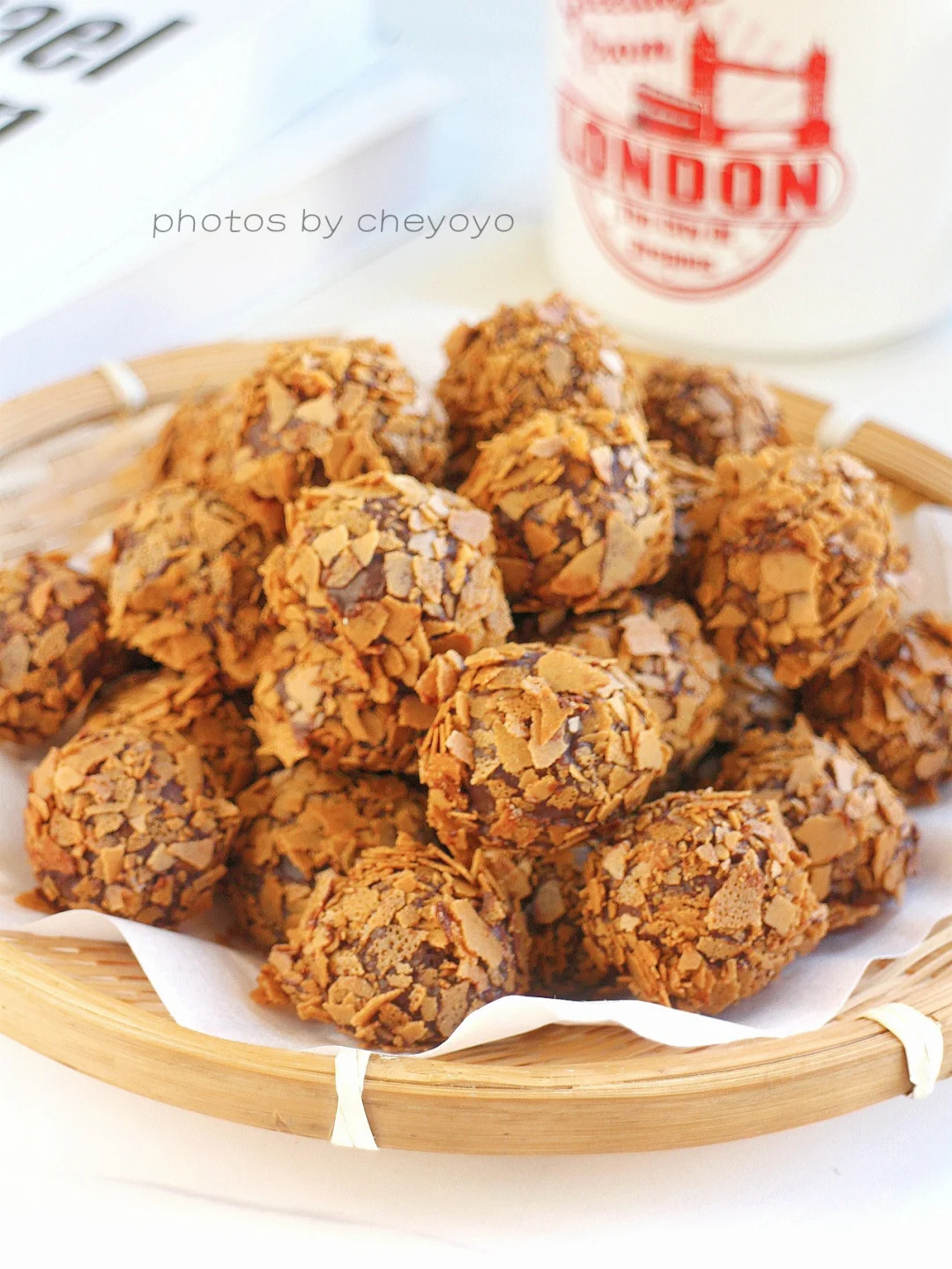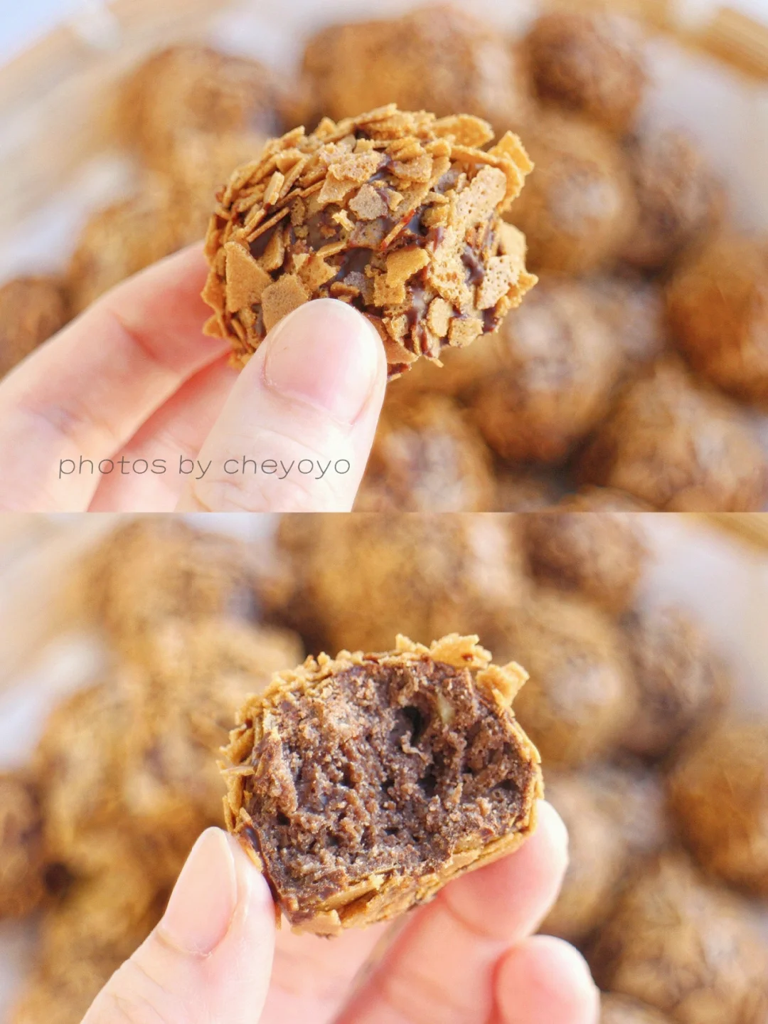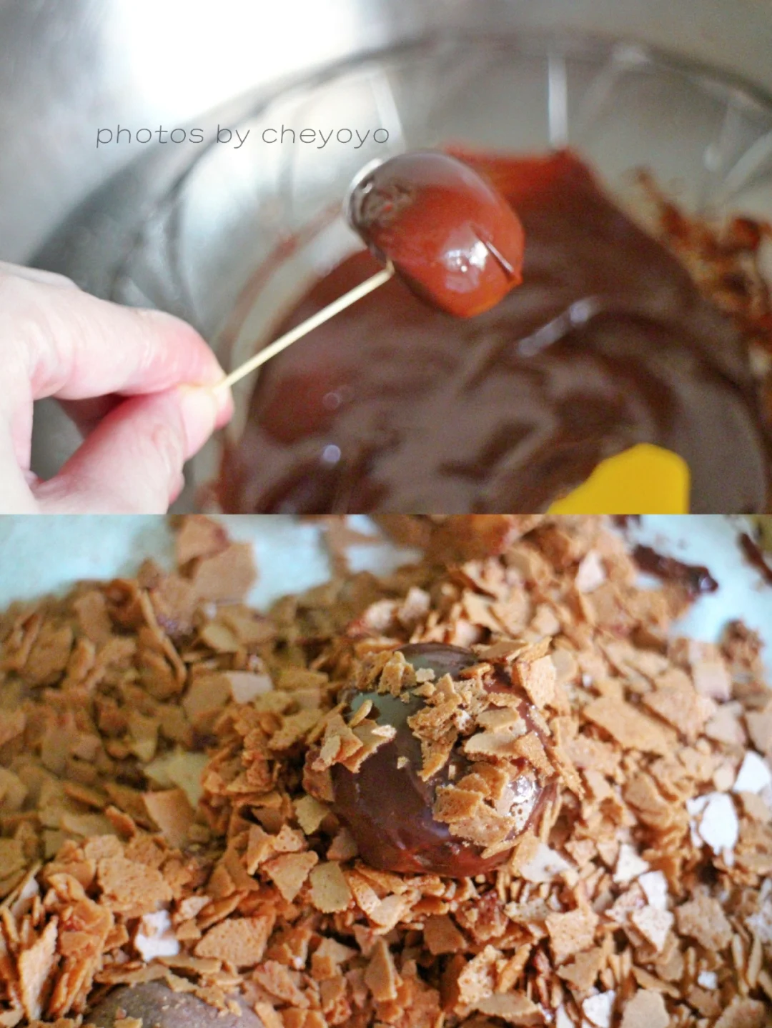 ④ 黑巧克力隔热水融化,放入曲奇裹上一层巧克力,再放到可可薄脆中滚一圈,送入冰箱冷藏定型就可以啦!