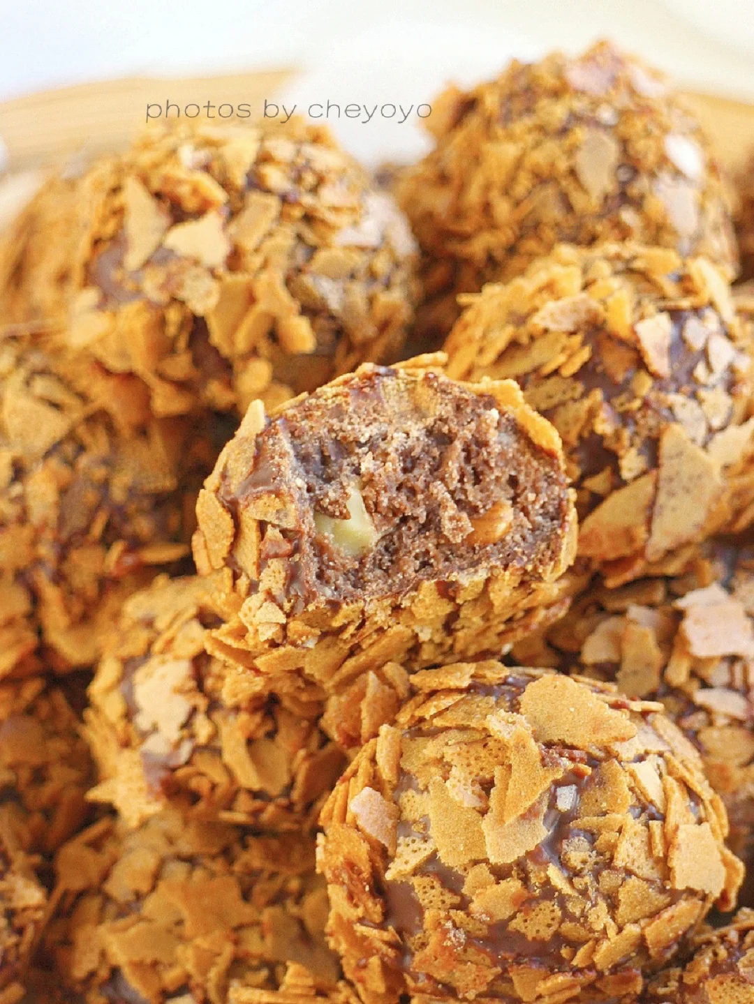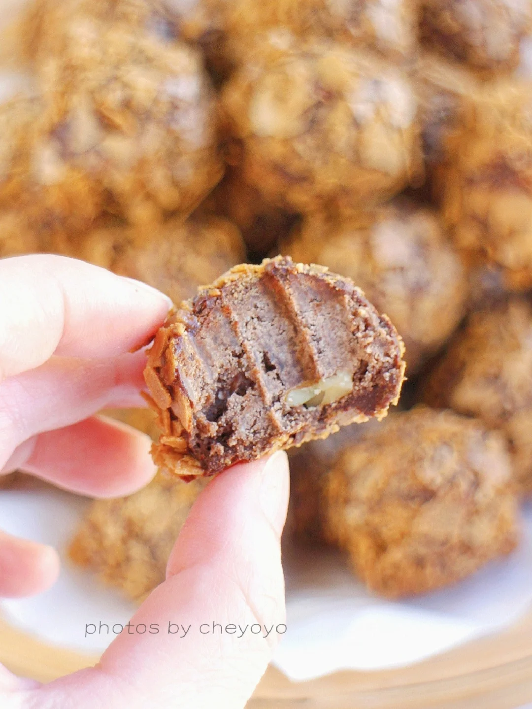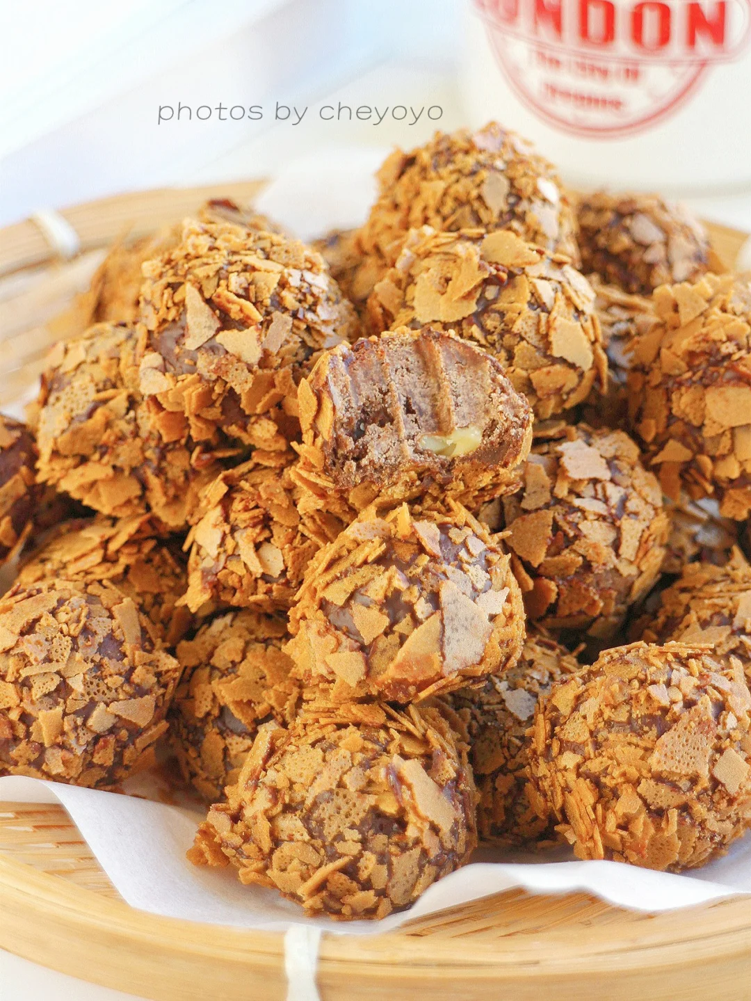 ④ 黑巧克力隔热水融化,放入曲奇裹上一层巧克力,再放到可可薄脆中滚一圈,送入冰箱冷藏定型就可以啦!