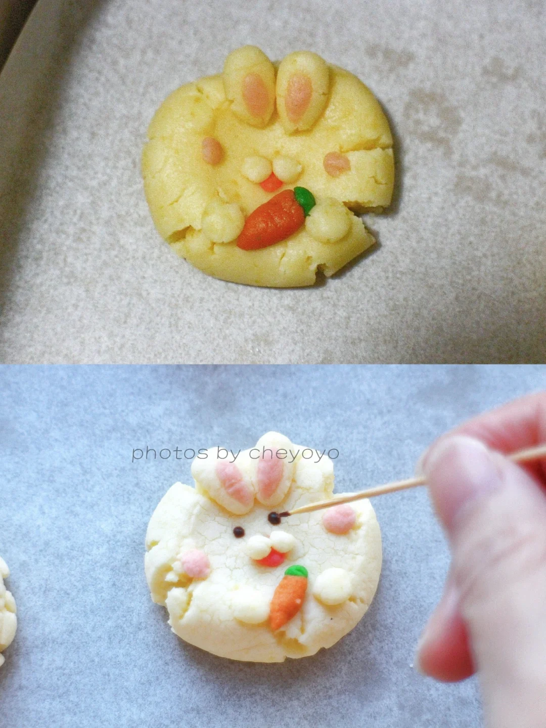 ④ 剩余大面团均匀分成10g/份的小球,摆在烤盘上用大拇指按扁,再安装上耳朵、鼻子、腮红、手手和萝卜;