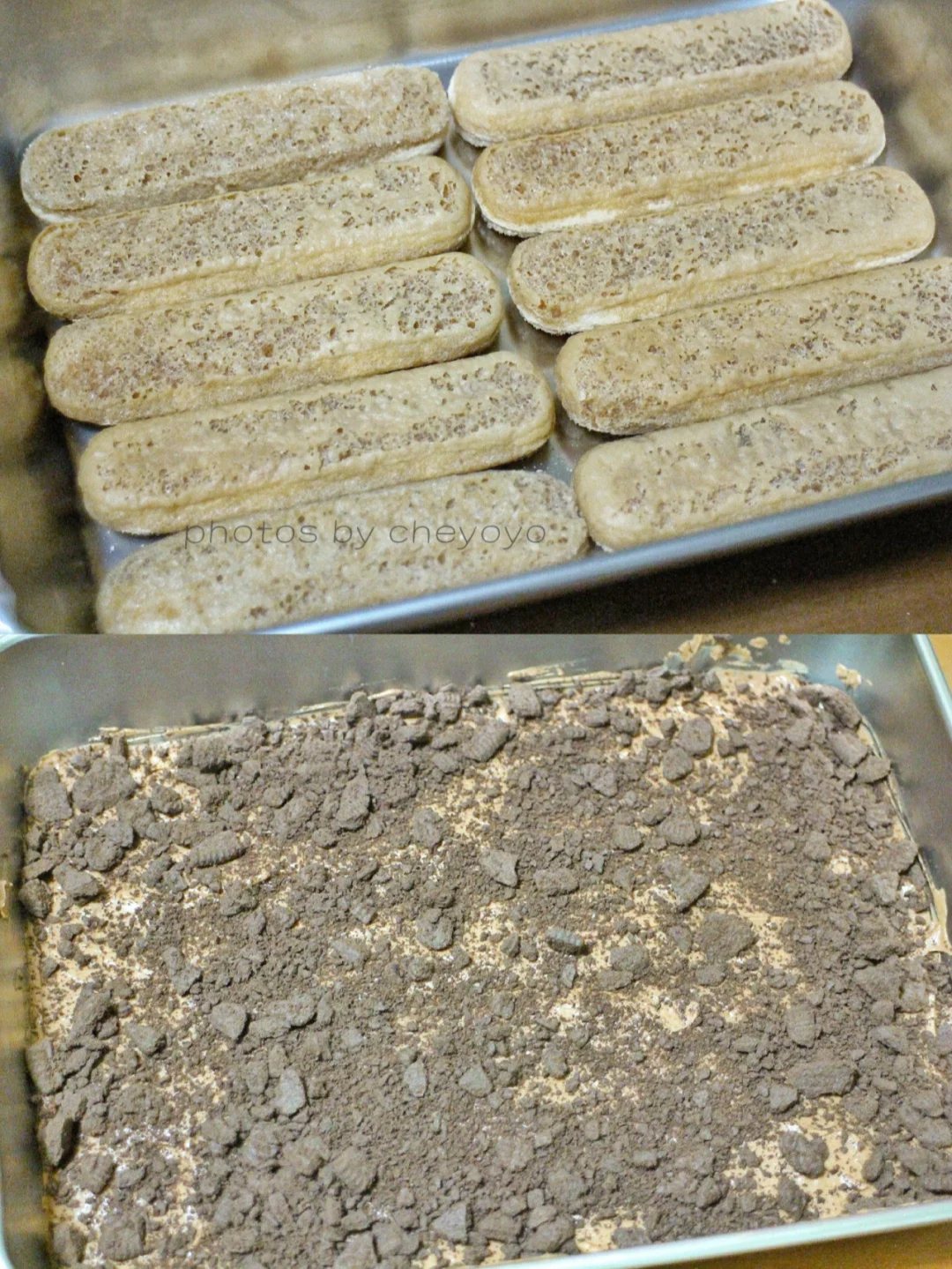 ④ 手指饼蘸咖啡液,摆在容器底部,倒上蛋黄芝士糊,撒上奥利奥碎,再铺一层蘸了咖啡液的手指饼、蛋黄芝士糊,撒上奥利奥碎,送入冰箱冷藏4小时,用奥利奥饼干进行装饰就可以啦[黄金薯R][黄金薯R]