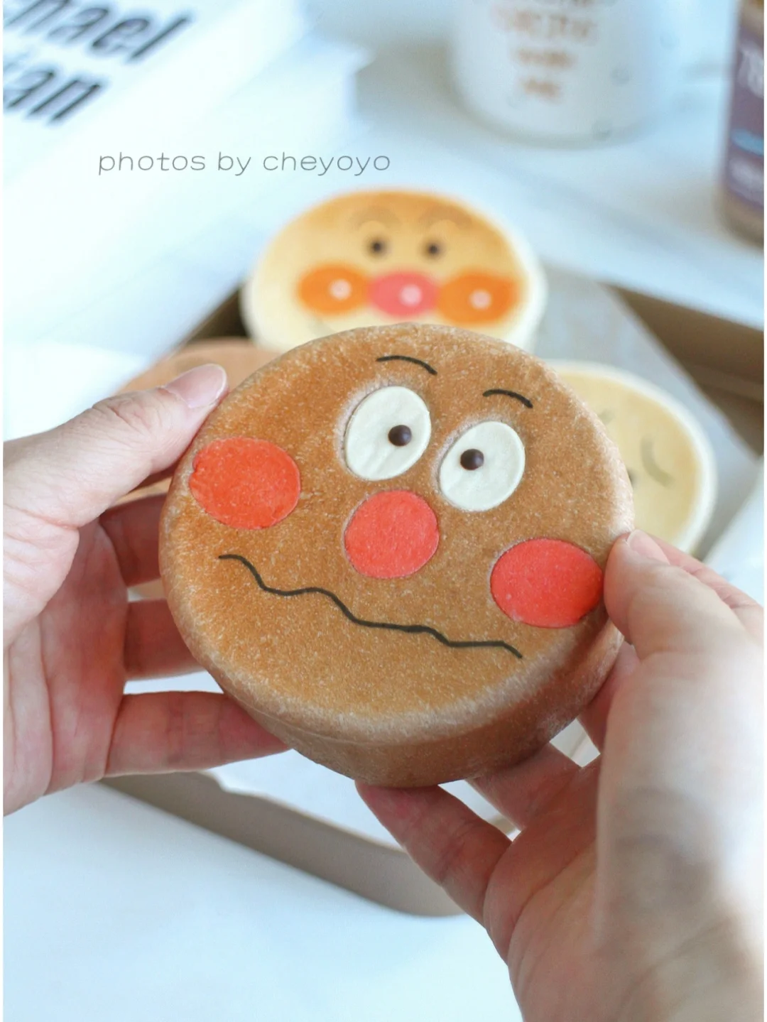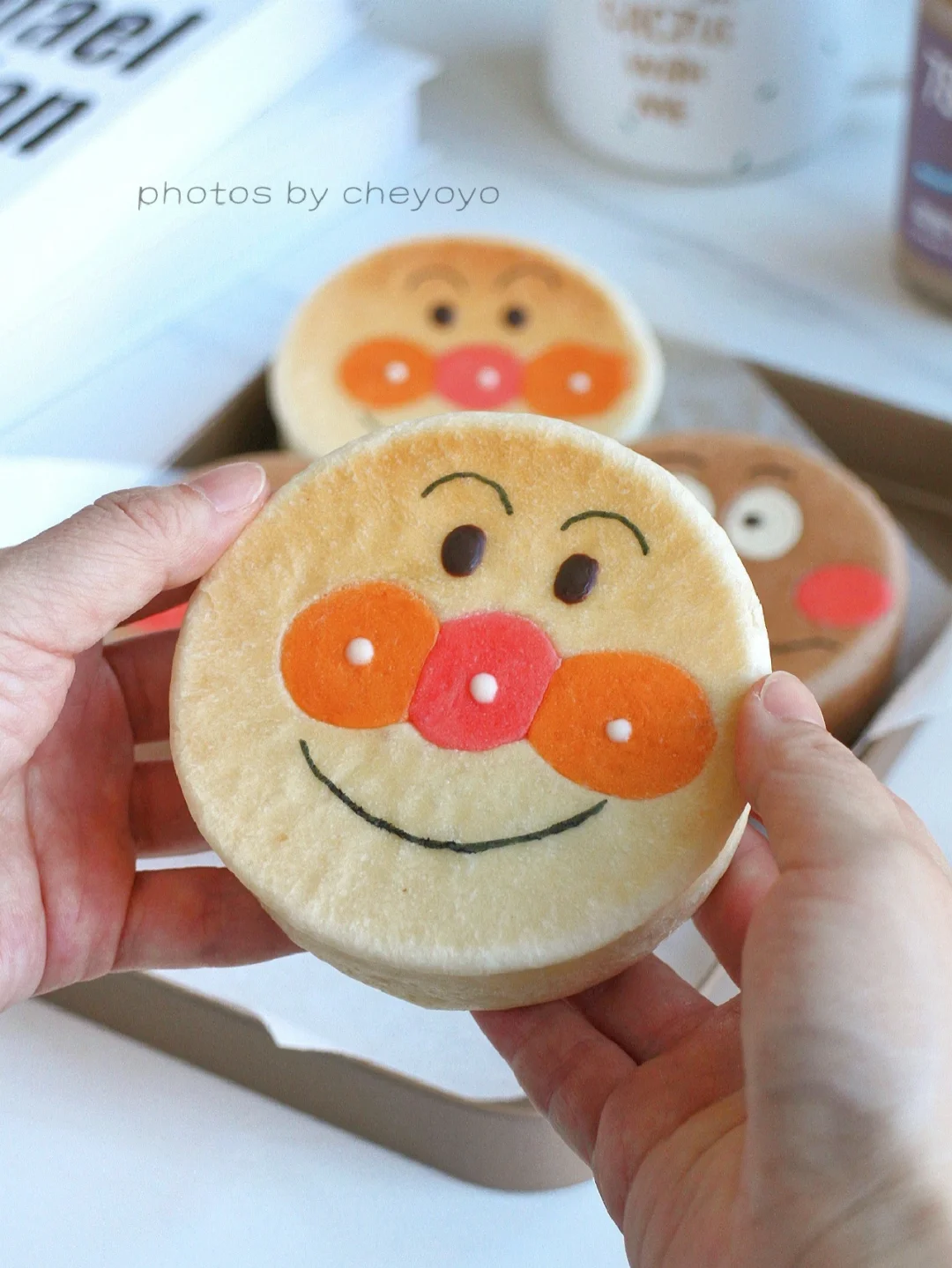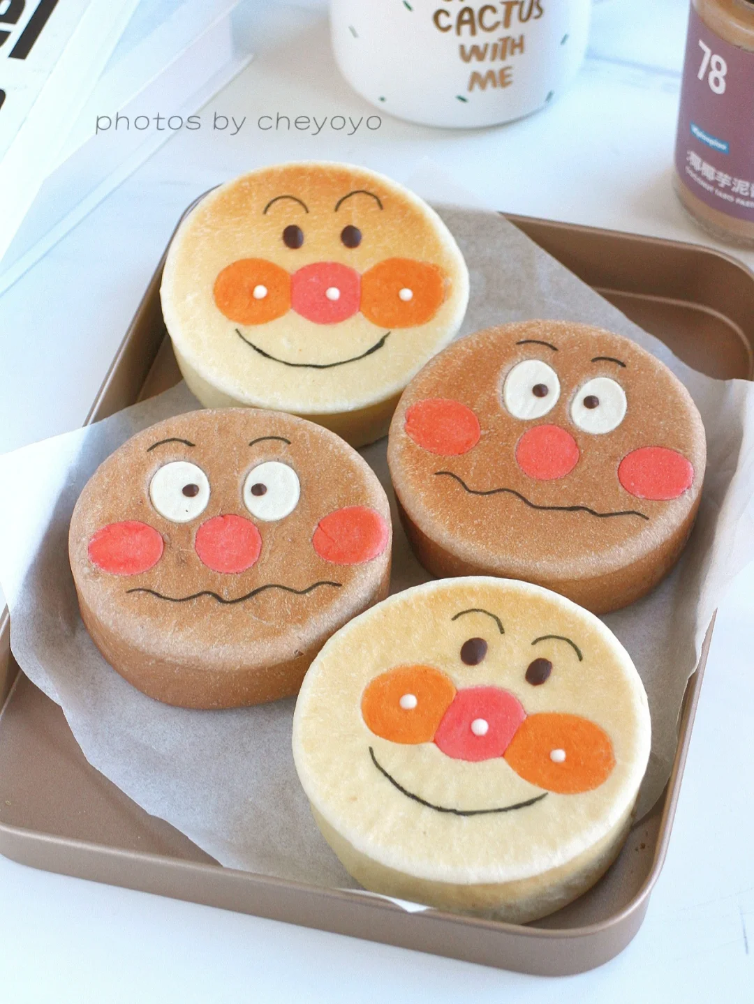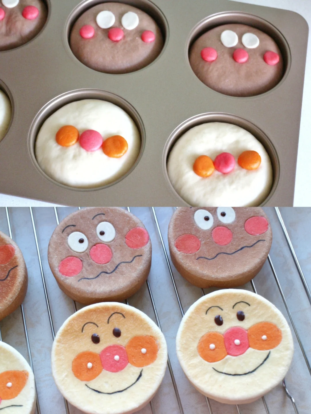 ⑥ 送入170度烤箱烘烤15分钟,冷却后用巧克力和色素笔画出表情就可以啦~[萌萌哒R][萌萌哒R]