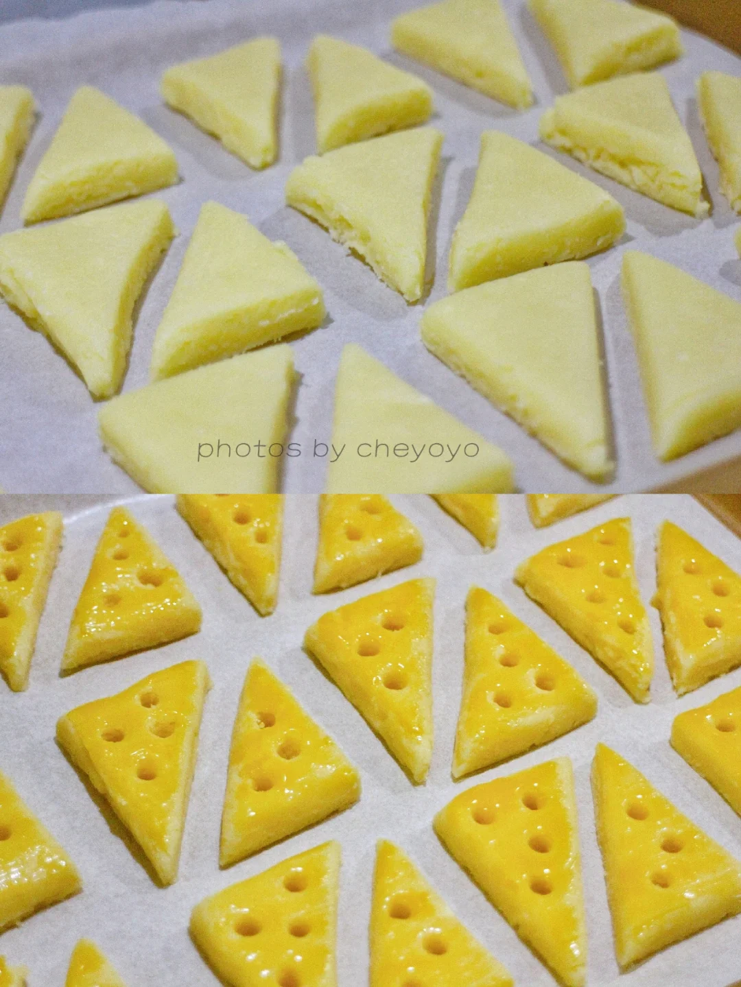 ④ 面团擀平后切成三角形,用吸管扎出孔洞,表面刷蛋黄;