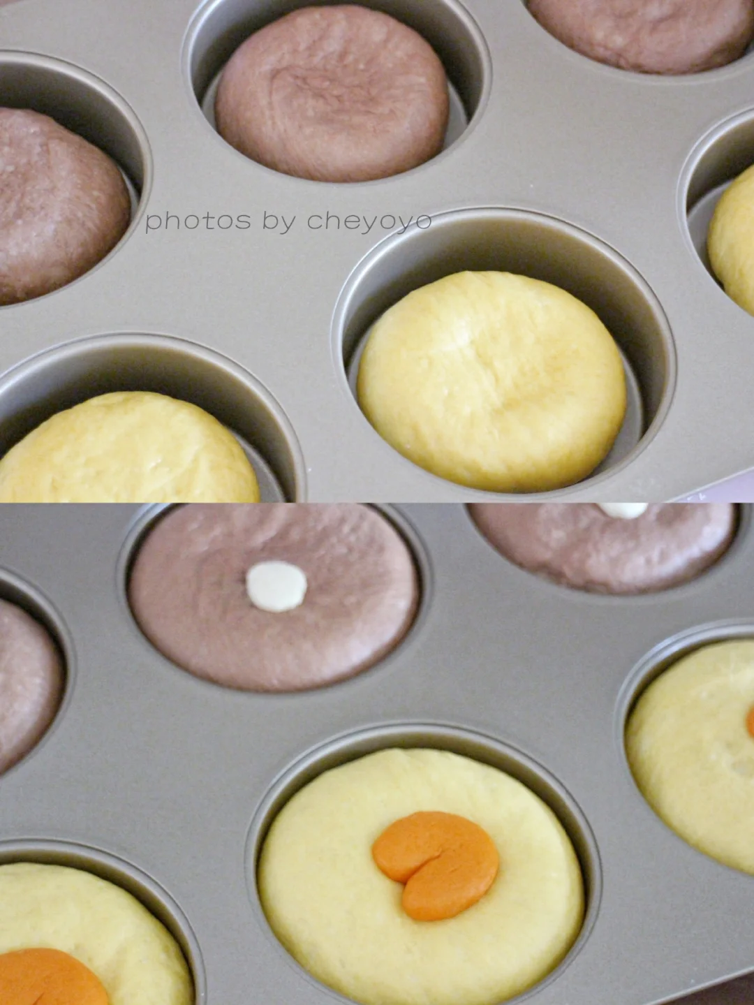 ④ 大面团滚圆擀开,包入红豆沙,收口捏紧向下压扁,放入模具中。橘色小面团搓长对折,原色小面团搓成椭圆形,摆在大面团上;