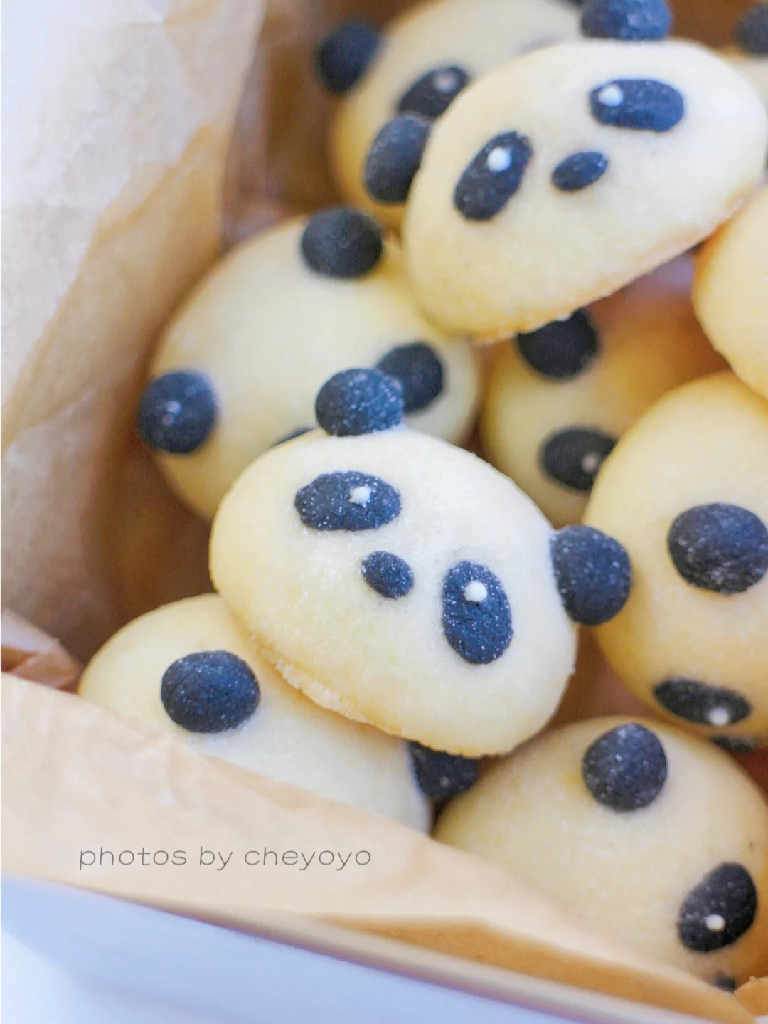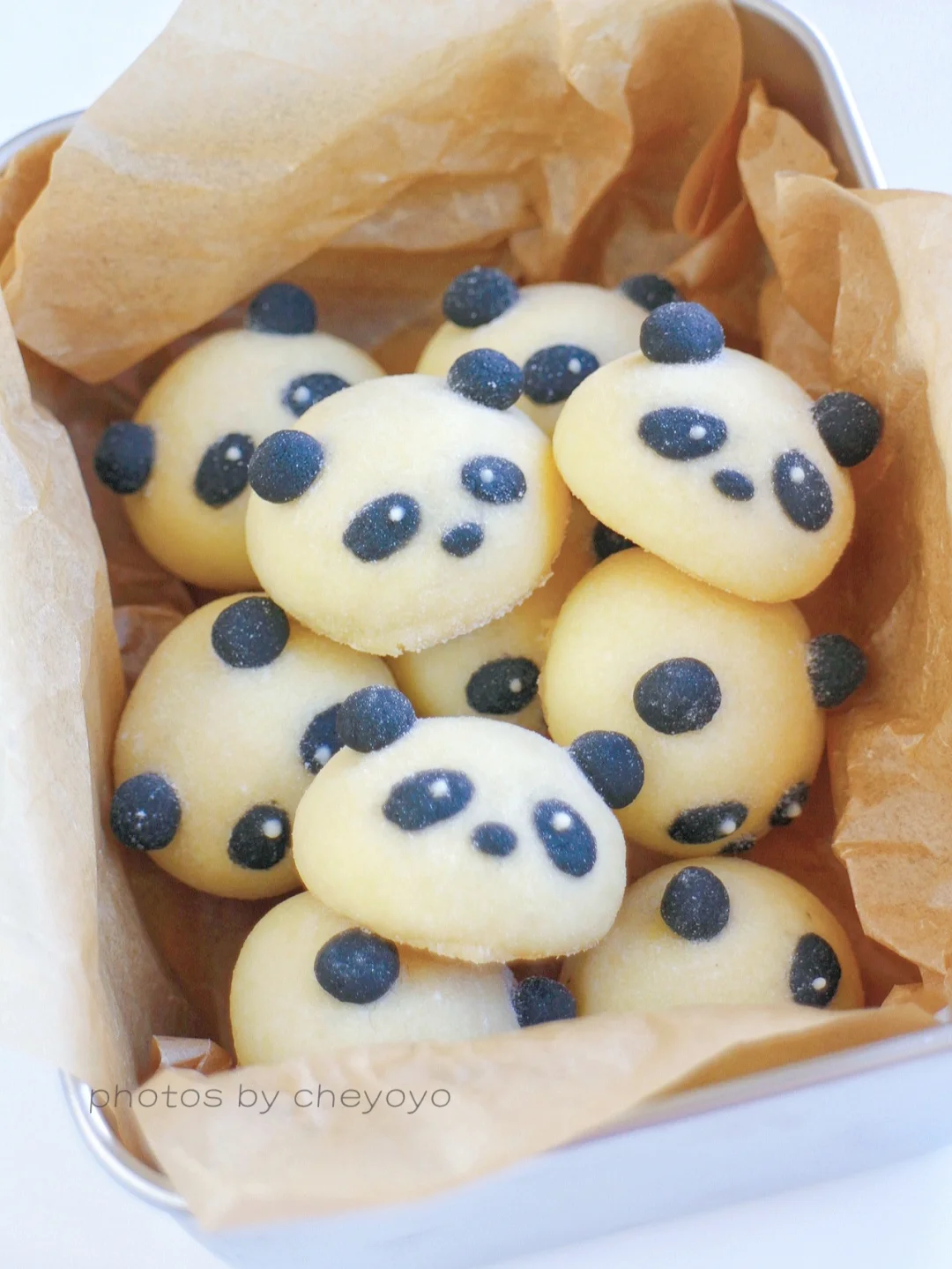 ⑤ 冷却后用白巧克力画上眼睛,筛上糖粉,完成~