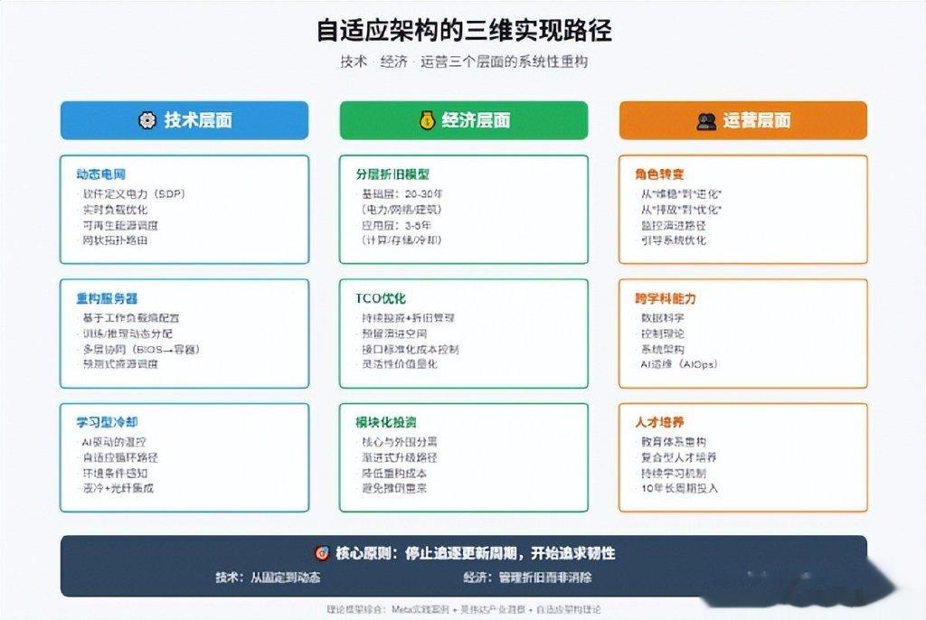 自适应架构的经济学逻辑是:既然无法避免三到五年的硬件更新周期,那就不应该把数据中心设计成“50年不变”的建筑,而应该设计成“核心持久、外围灵活”的模块化系统。