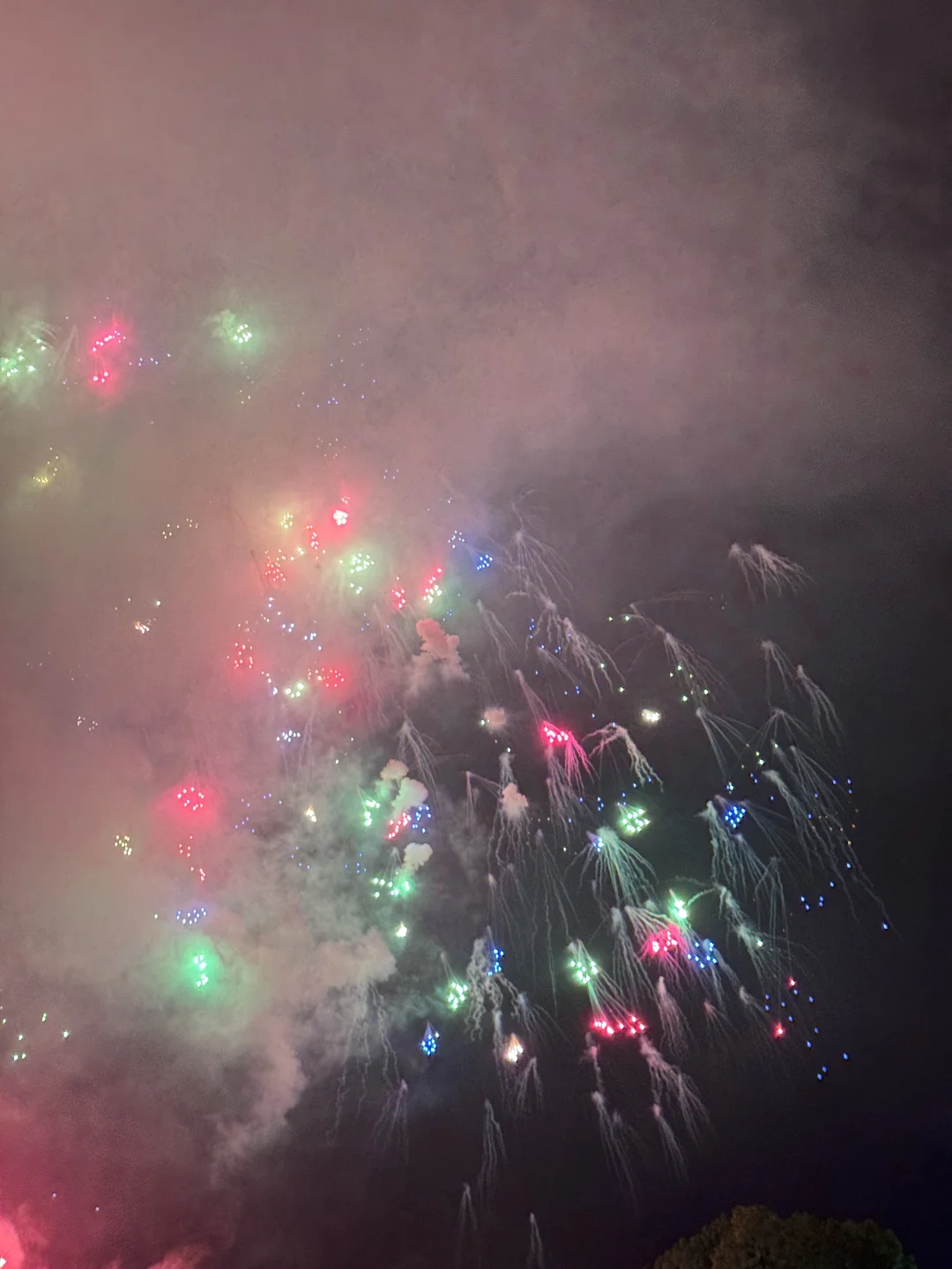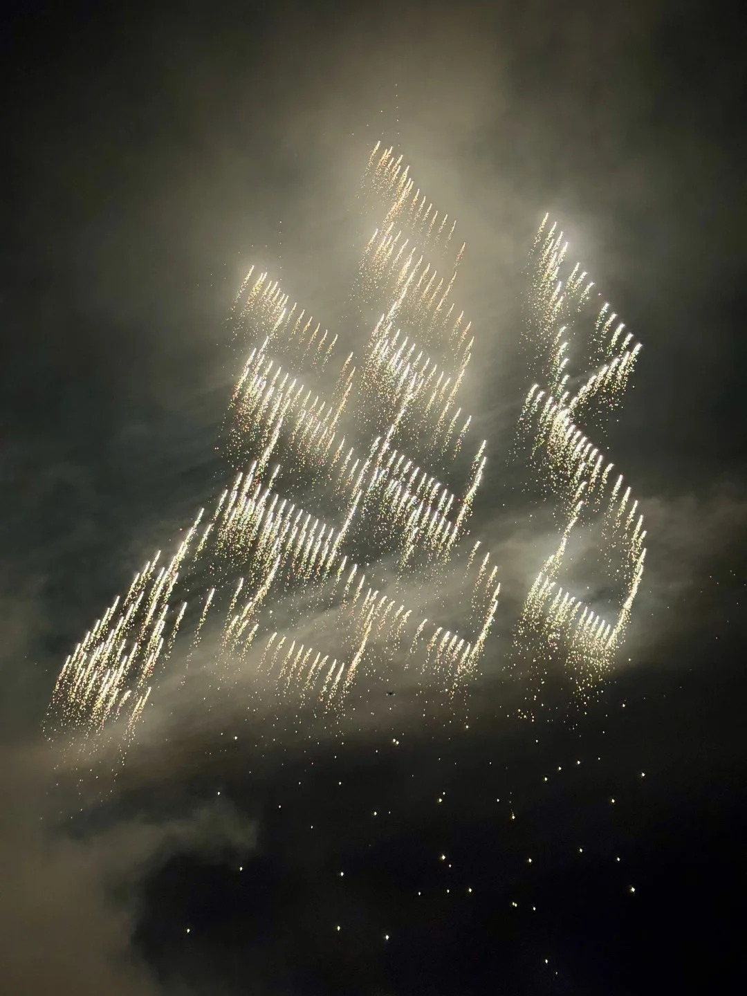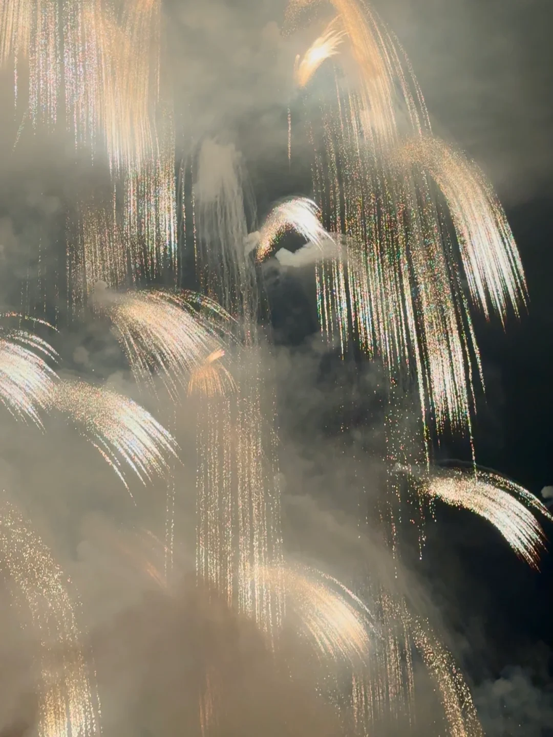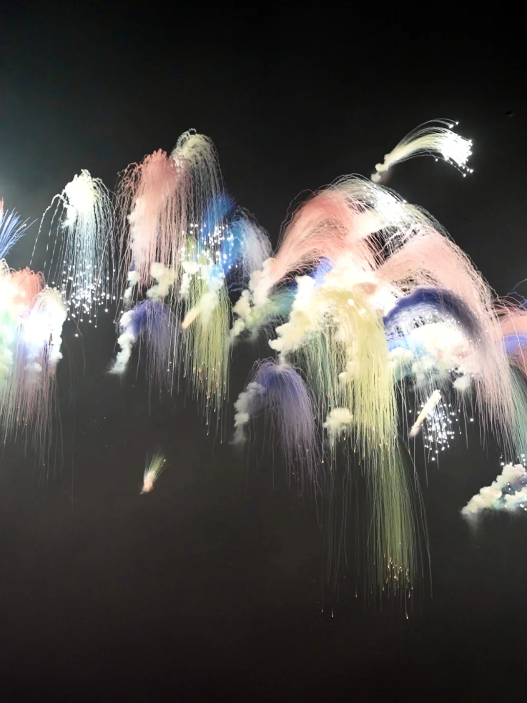 到点后呢它不是纯放烟花,是有几个主题配合的,所以会串联起故事感,有一说一,浏阳烟花你是有点料子的,七彩祥云、无人机烟花...各种“大烟花”bingbingbangbang地就你懂吧哈哈哈~but就是烟有点儿大(这事儿真的得看运气🤣),所以每段烟花中间就准备了一些歌舞表演~