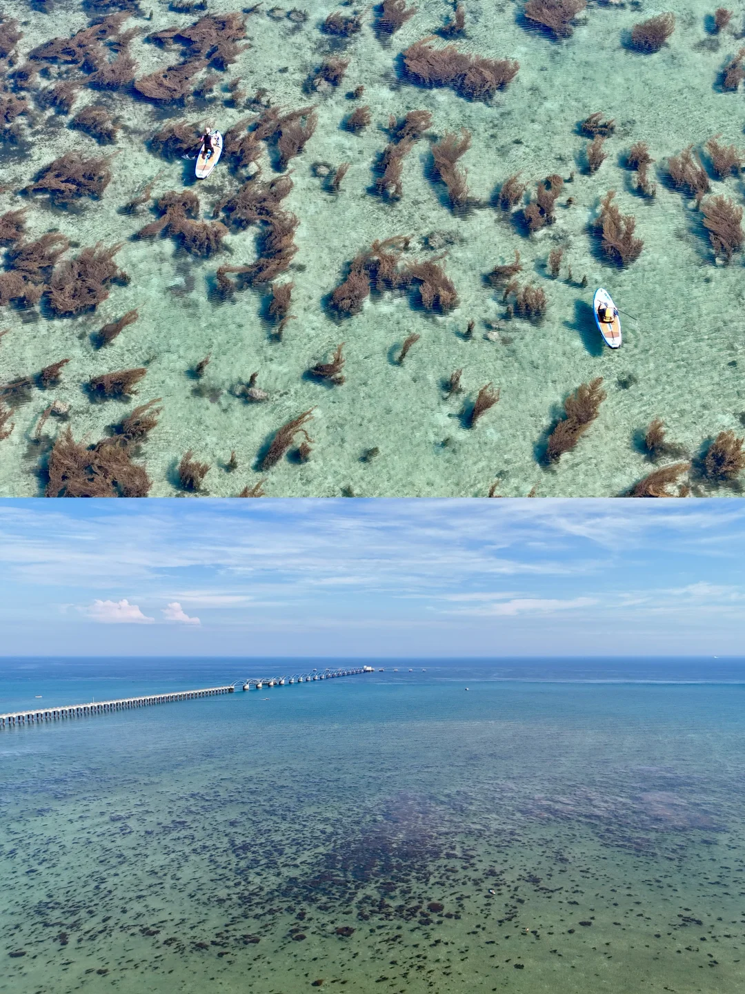 📍导航“涠壹海木屋”,除了能看到蓝桥,还有网上非常火的玻璃海!可以坐玻璃船或浆板进入,肉眼可见大片的马尾藻群+果冻般的海水,非常壮观