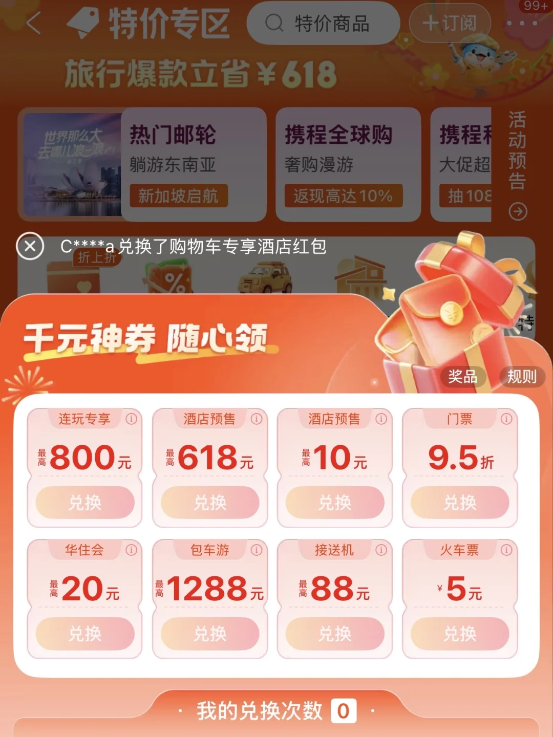 用户完成下单、加购、裂变、浏览等任务后,可获得领奖次数,用于兑换奖池内任意优惠券【满2599-80,最高减800的酒店套餐阶梯满减券】