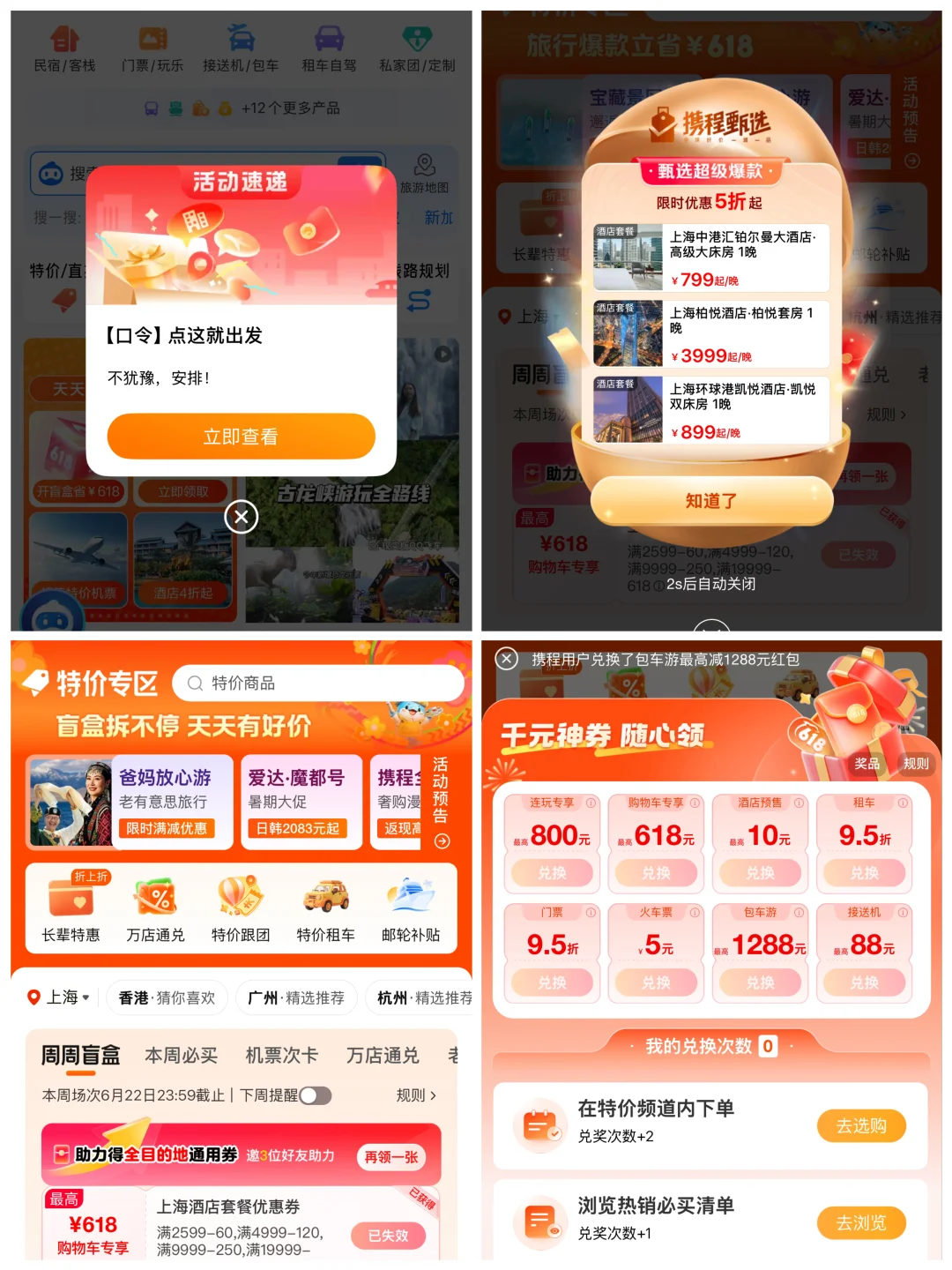 1️⃣盲盒拆不停,天天有好价,每周频道内参与一次拆盲盒,获得满2599-60,最高减618的指定目的地满减券;通过助力可升级为不限目的地的通用券