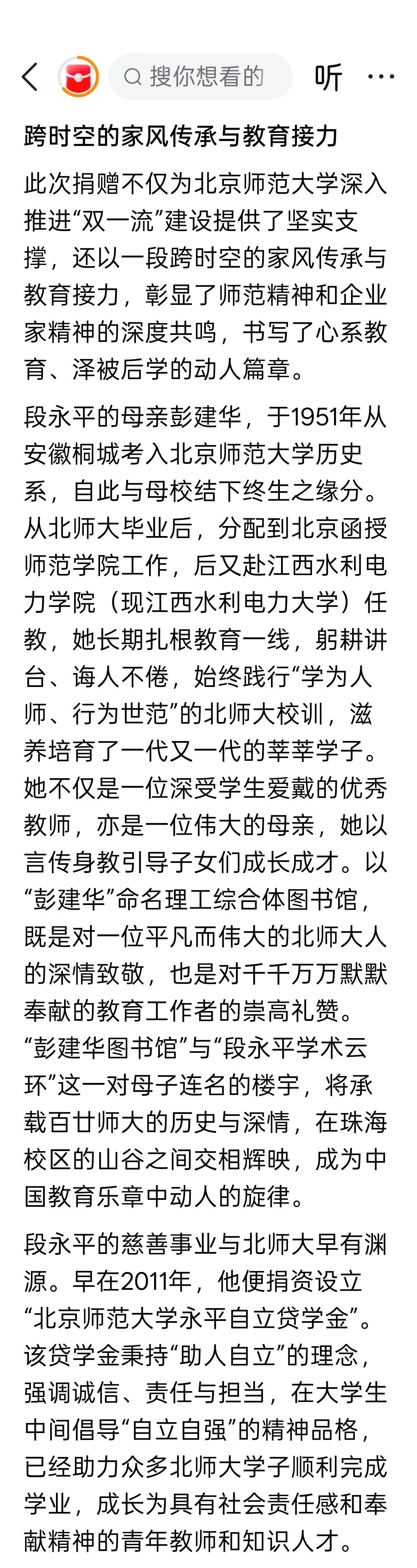 段永平捐赠2.2亿元支持北京师范大学建设。 段永平的母亲彭建华,于1951年从安徽桐城考入北京师范大学历史系,自此与北师大结下终生之缘分。 为感谢段永平及其母亲彭建华对学校发展的重要贡献,北京师范大学将珠海校区核心教学枢纽理工综合体学术云环冠名为“段永平学术云环”,并将理工综合体图书馆冠名为“彭建华图书馆”。