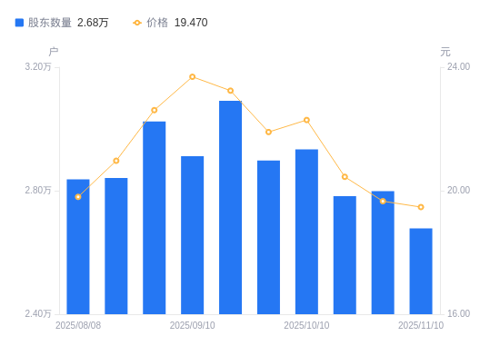 日期A股户数(户)流通A股户均持股数(股)户均持股市值(万元)2025-11-102678016232.4831.602025-10-312798415534.0930.542025-10-202782315623.9831.952025-10-102934014816.1533.032025-09-302897715001.7532.852025-09-193091014063.6032.682025-09-102911414931.1635.372025-08-293024314373.7732.502025-08-202841515298.4632.082025-08-082836815323.8130.34