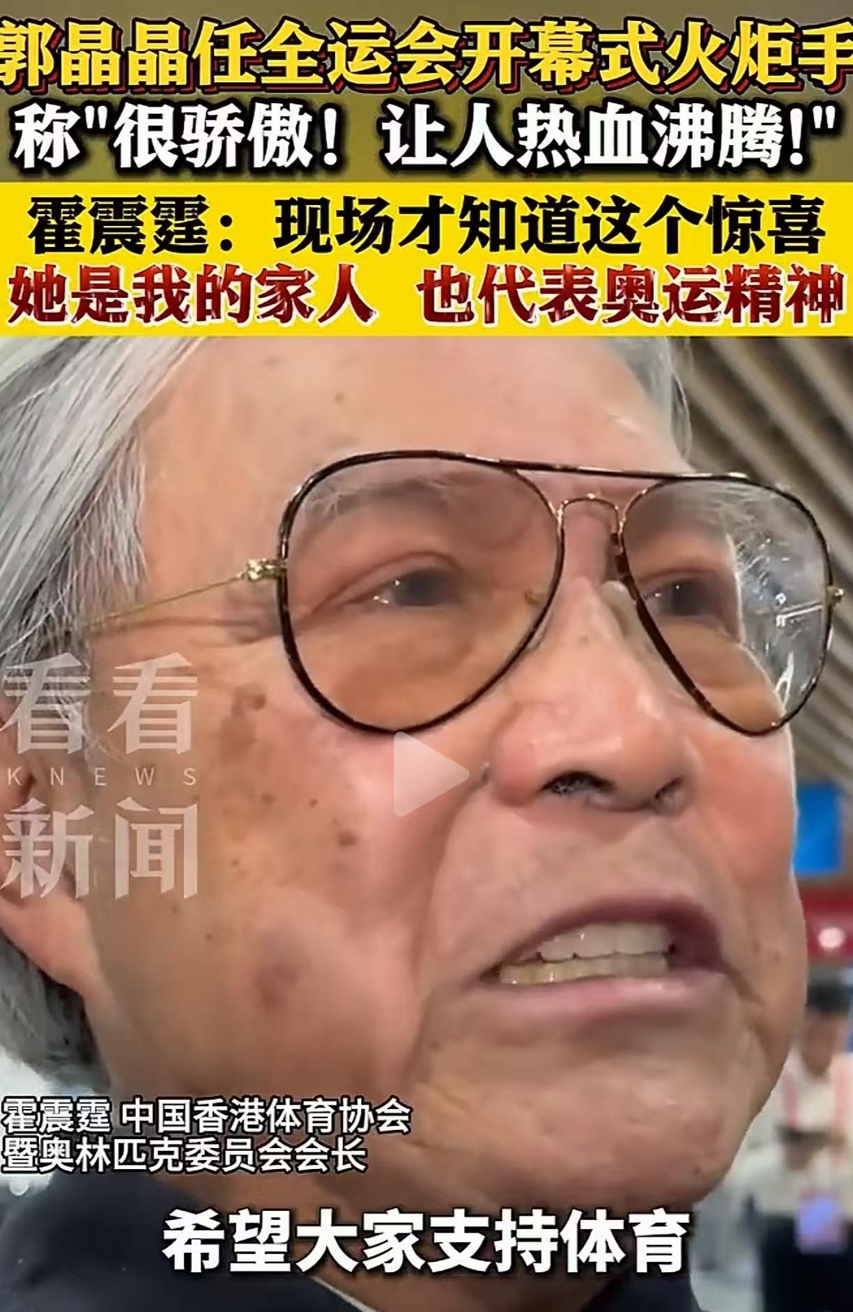 霍震霆看直播惊掉眼镜 儿子郭晶晶当火炬手,自己竟是最后一个知道的人,她都没有提前告诉我,“晶晶能作为全运会开幕式火炬手作为家人很骄傲,同时她也是代表的奥运精神”,希望大家支持体育! 郭晶晶可是拿了31个世界冠军的奥运冠军,难怪霍老爷子当年说他们家是沾了郭晶晶的光。 晶晶刚好安排在第三棒,举着火炬,正好经过主席台前,这个设计实在太惊喜动人了,看得出来当时老人家有多自豪 一句家人,言语表情里全是对郭晶晶的满意,儿子和家族都选对了人! 一家子都是爱国之人,给他们点赞👍