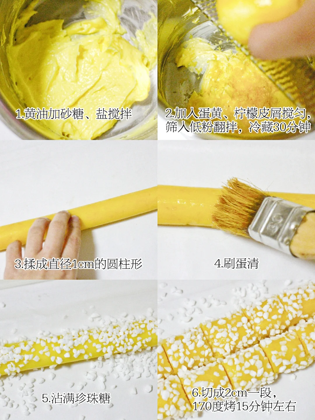 ④ 面团放在油纸上整理成直径1cm的圆柱形,表面涂蛋清,滚上珍珠糖,切成2cm一段,均匀铺在烤盘上;