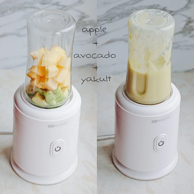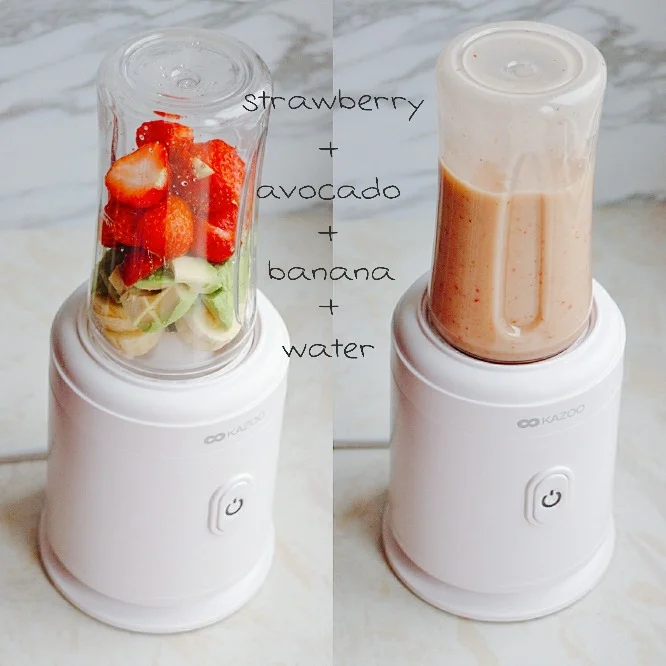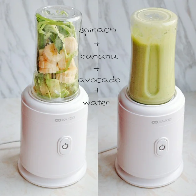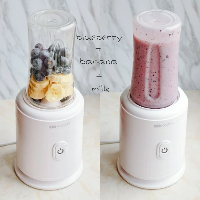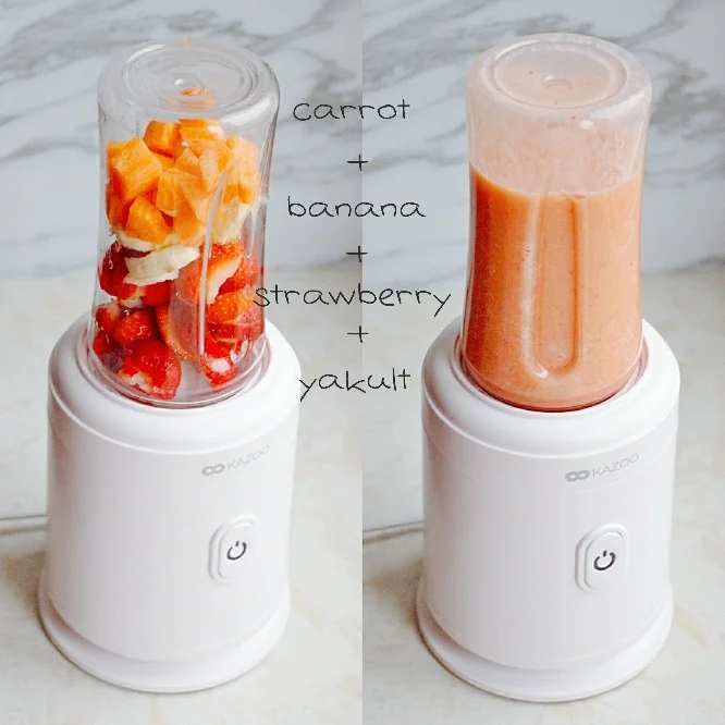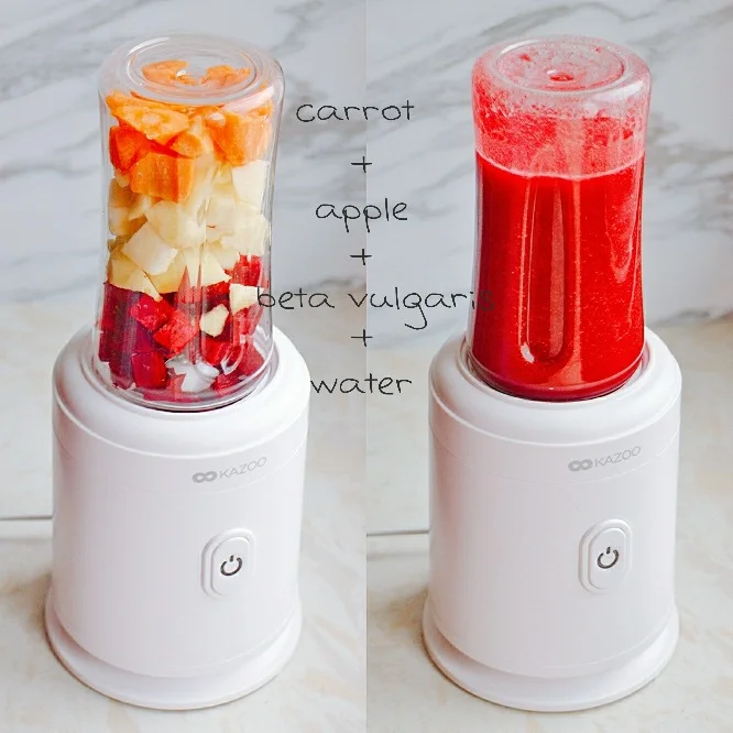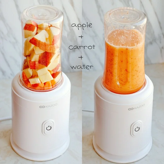 1.我使用的是KAZOO料理机,小巧不占地方,容易清洗;绞打速度快,胡萝卜一类的坚硬食材都可以打的很细致;带有一大一小两个随行杯,密封严实,放在包包里也不用担心漏水。